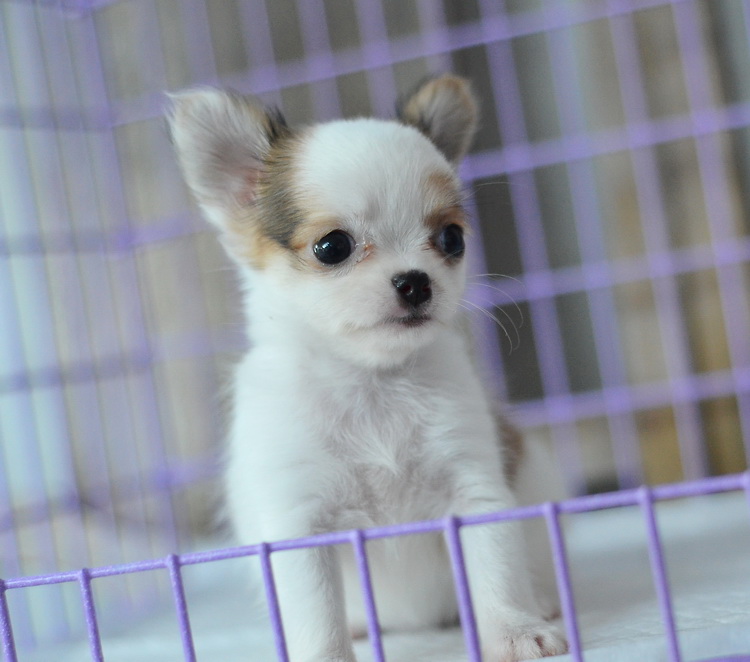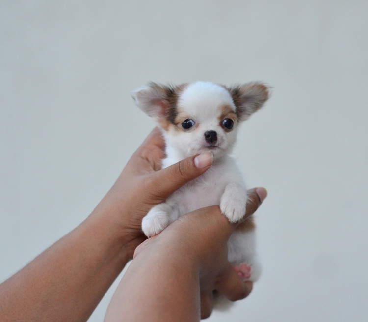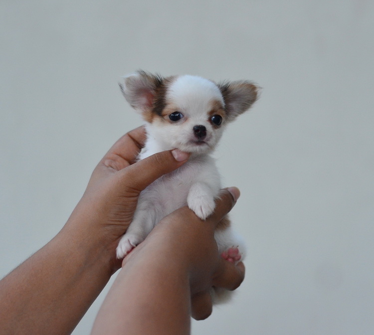 ชิวาวาเพศเมียขนยาวสีขาวน้ำตาล หัวโตหน้าสั้นตาโตน่ารัก สีสวย มาร์กสวย ไซด์เล็ก