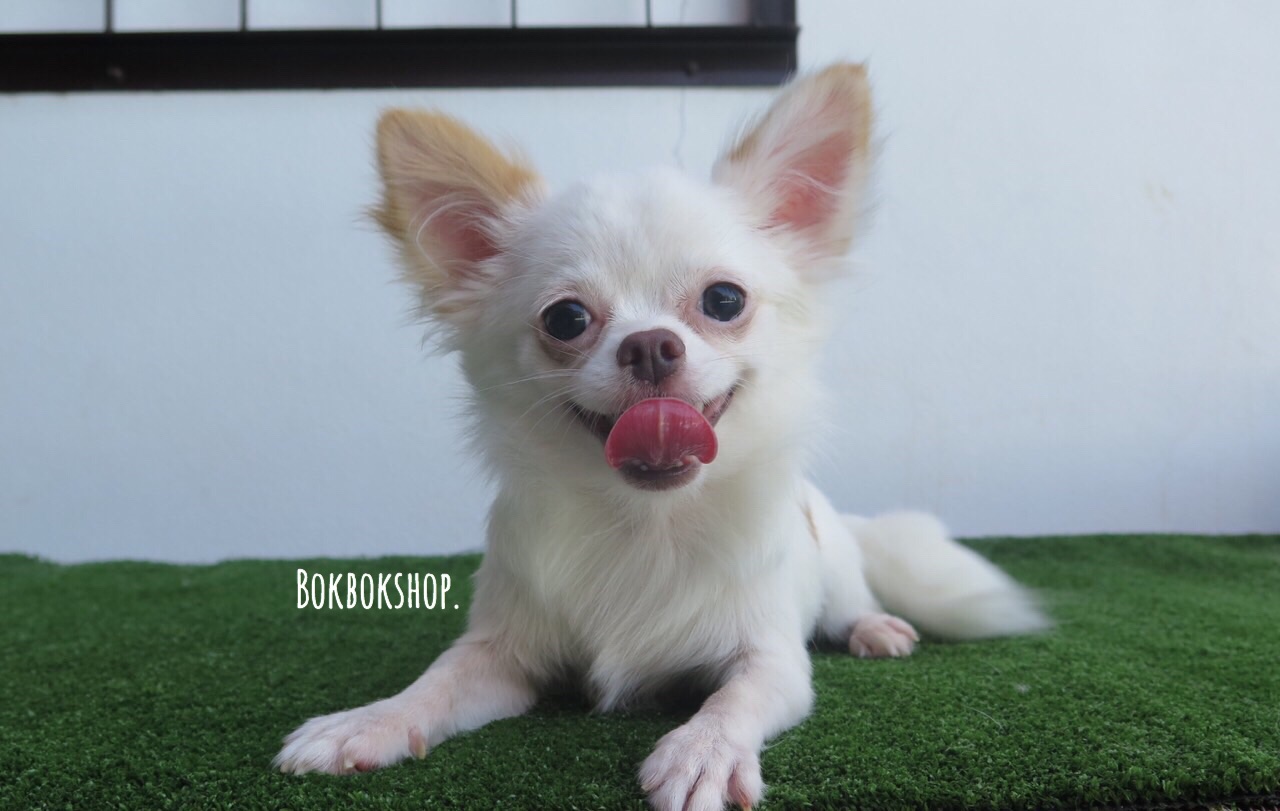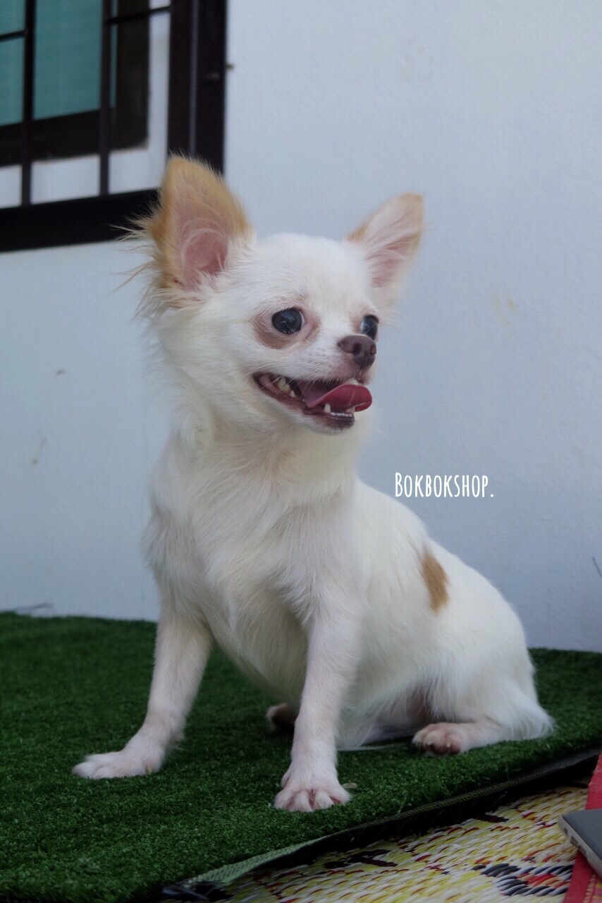 เเบ่งขายชิวาวาขนยาวสีขาวน้ำตาลเพศชาย 8เดือน