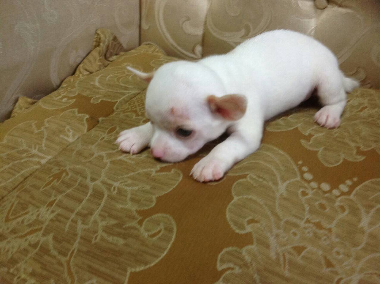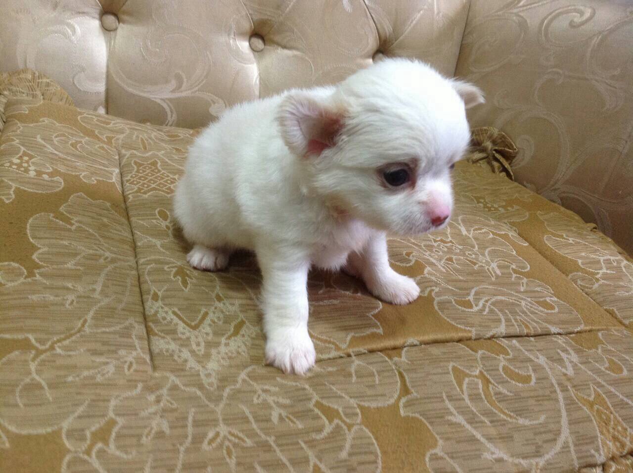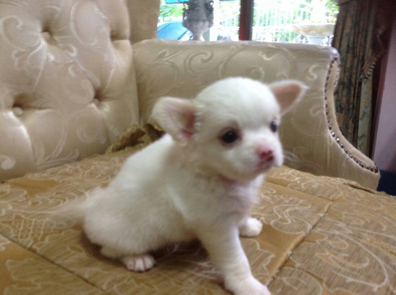 ลูกชิวาวาขนสั้น สีขาวเพศผู้. และเพศเมียขนยาว อายุ 40วัน น่ารักมากไซค์เล็ก