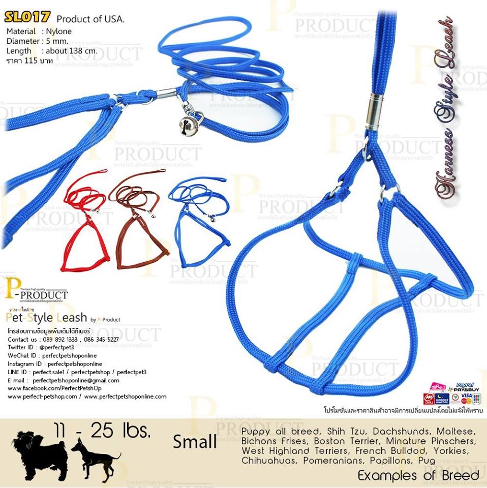 รหัสสินค้า SL017 สายจูงสุนัข ขนาดเล็กแบบสวมหน้าอกปรับระดับได้แบบมีกระพรวน ผลิตจาก Nyloneถัก ขนาดเส้นผ่านศูนย์กลาง 5 mm. ความยาวโดยประมาน 138 cm. ราคา 115 บาท เหมาะกับสุนัขขนาดเล็ก TOY DOGS เช่น Chihuahau , Jack Russell , Pekingese , Pug , West Highland , Shihtzu Pomeranian , Miniature หรือสัตว์เลี้ยงที่มีขนาดเหมาะสมทุกชนิดสายจูงสุนัขคุณภาพจาก P-PRODUCT
