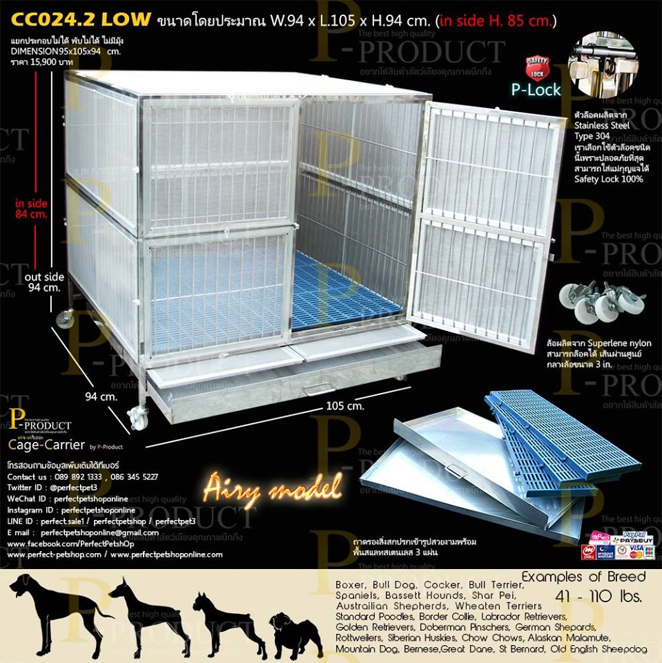 รหัสสินค้า CC024.2 LOW Model Airy กรงขนาด 3 สแลท ประตูบานเปิดขวาตัวล็อคแบบ P-LOCK แน่นหนา ความสูงมาตรฐาน 94 x 105 x 94 cm. ราคา 15,900 บาท เป็นกรงแบบตายตัว แยกประกอบไม่ได้ เหมาะกับสุนัข เช่น Cocker,Basenji,Bull Terrier,Baseset Hound,French Bulldog,Bulldog,Chow Chow,Bangkaew,Staffordshire Terrier,Thai RidgeBack,Golden Retriever,Labrador Retriever, หรือสัตว์เลี้ยงที่มีขนาดเหมาะสมทุกชนิดกรงสัตว์เลี้ยงคุณภาพจาก P-PRODUCT