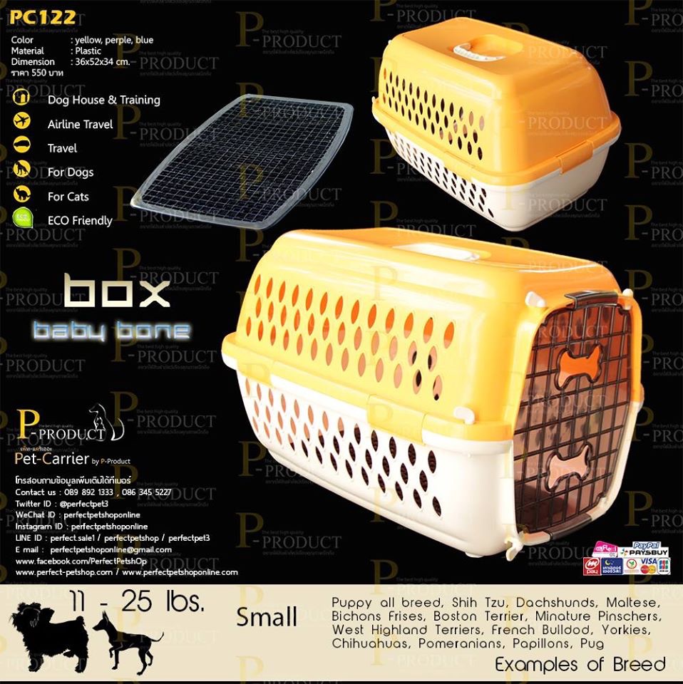 รหัสสินค้า PC 122 กล่องเดินทางสัตว์เลี้ยงขนาด Small ขนาด 36ก x 52ย x 34ส cm. ราคา 550 บาท เหมาะกับสุนัขขนาดเล็ก เช่น แมว ลูกสุนัข หรือสุนัขขนาดเล็ก Puppy or Chihuahau,Jack Russell,Pekingese,Pug,West Highland,Pomeranianหรือสัตว์เลี้ยงขนาดเล็กถึงขนาดกลางทุกชนิด หรือสัตว์เลี้ยงที่มีขนาดเหมาะสมทุกชนิด กล่องเดินทางสัตว์เลี้ยงคุณภาพจาก P-PRODUCT