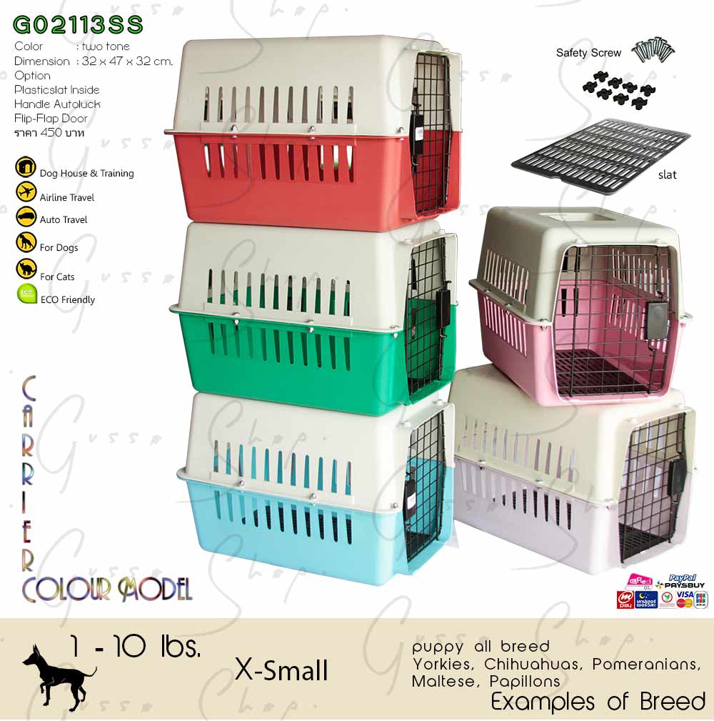 ขนาด 32ก x 47ย x 32ส cm. ราคา 450 บาท เหมาะกับสุนัขขนาดเล็ก เช่น Puppy or Chihuahau,Jack Russell,Pekingese,Pug,West Highland,Pomeranianหรือสัตว์เลี้ยงขนาดเล็กถึงขนาดกลางทุกชนิด หรือสัตว์เลี้ยงที่มีขนาดเหมาะสมทุกชนิด กล่องเดินทางสัตว์เลี้ยงคุณภาพ