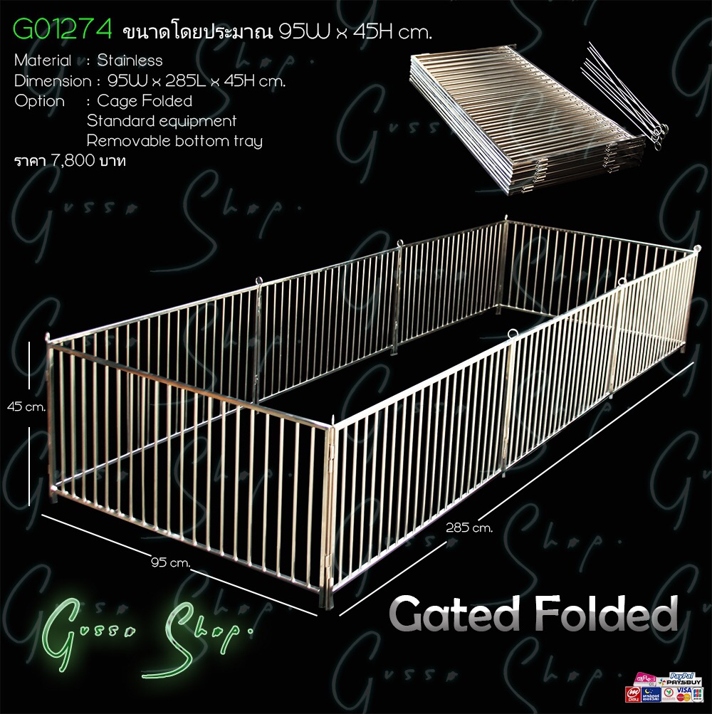 GATED CARRIER คอกสนามสเตนเลสปรับเปลี่ยนรูปแบบได้หลากหลายตามความเหมาะสมแยกเก็บได้เพิ่มช่องได้ ผลิตขึ้นจากสเตนเลสกล่องและแป๊บ ขนาดเมื่อประกอบเสร็จ 95ก x 285ย x 45ส cm. ราคา 7,800 บาท