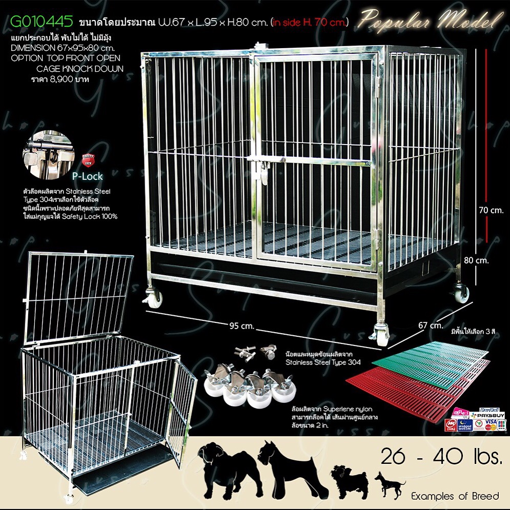 ขนาดโดยประมาณ W.67 x L.95 x H.80 cm. (in side H. 70 cm.) สามารถแยกประกอบได้ เปิดฝาบนได้ ใช้เพลา ขนาด 5 mm. มาผลิตในส่วนของซี่กรง มีพื้นสแลท ถาดรองสิ่งสกปรก และล้อมาให้ครบชุดเป็นอุปกรณ์มาตรฐาน