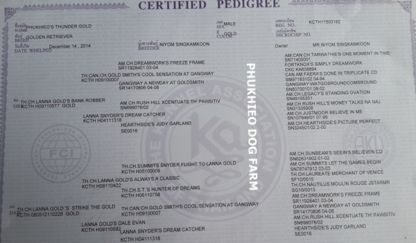 กับแม่พันธุ์คุณภาพ Th.Ch.Lanna Gold's Strike The Gold. เกิดวันที่ 14 ธันวาคม 2557 อายุ 9 เดือน