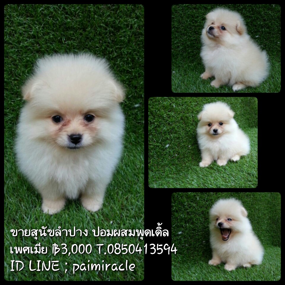 ปอมผสมพุดเดิ้ลเพศเมีย จ๊ะพร้อมถ่ายพยาธิและฉีดวัคซีน เกิดวันที่ 1 กันยายน 2558 น่ารักแข็งแรง ทานอาหารเองได้แล้วนะค่ะ พร้อมย้ายบ้านจ๊ะลูกค้าที่อยู่ลำปางหรือจังหวัดใกล้เคียงมาดูเด็กๆได้ที่บ้านข้างเซนทรัลลำปางทางเรามีบริการจัดส่งและส่งทางเครื่องบินด้วยค่ะ