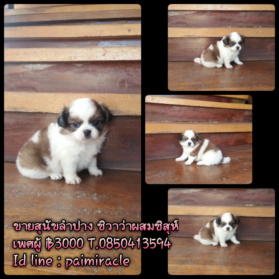 ชิวาว่าผสมชิสุห์เพศผู้ จ๊ะพร้อมถ่ายพยาธิ เกิดวันที่ 9 กันยายน 2558 น่ารักแข็งแรง ทานอาหารเองได้แล้วนะค่ะ พร้อมย้ายบ้านจ๊ะลูกค้าที่อยู่ลำปางหรือจังหวัดใกล้เคียงมาดูเด็กๆได้ที่บ้านข้างเซนทรัลลำปางทางเรามีบริการจัดส่งและส่งทางเครื่องบินด้วยค่ะ