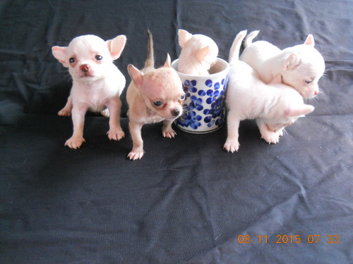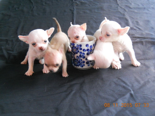 #ขายลูก ชิวาวา ขนสั้น สีขาวล้วนเเละสีลูกวัว หัวแอปเปิล หน้ากุดๆ ไซด์จิวๆ เพศผู้1เพศเมีย4ราคา 4500