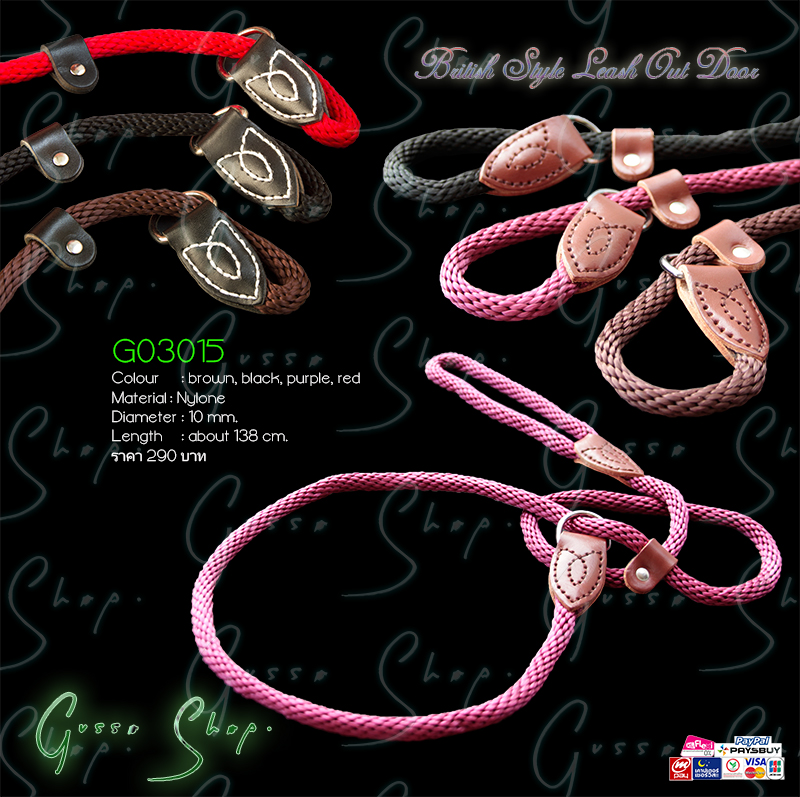 British Style Leash Out Door สายจูงสุนัข Nylone ขนาดเส้นผ่านศูนย์กลางโดยประมาณ 10 mm. ความยาวโดยประมาณ 138 cm. ราคา 290 บาท เป็นสายจูงแบบมีตัวคล้องคอมาให้ในตัว ปลายหัวรูดเย็บด้วยหนังแท้ สวยงาม ทนทานเหมาะกับสุนัขขนาดกลางจนถึงกลางไปใหญ่ เช่น Cocker,Basenji,Bull Terrier,Baseset Hound,French Bulldog,Bulldog,Chow Chow,Bangkaew,Staffordshire Terrier,Thai RidgeBack,Golden Retriever,Labrador Retriever, หรือสัตว์เลี้ยงที่มีขนาดเหมาะสมทุกชนิดสายจูงสุนัขคุณภาพ