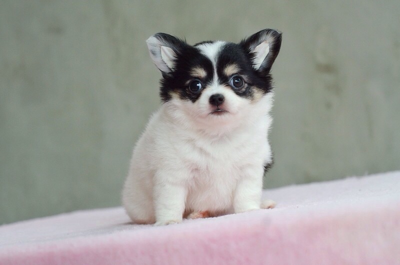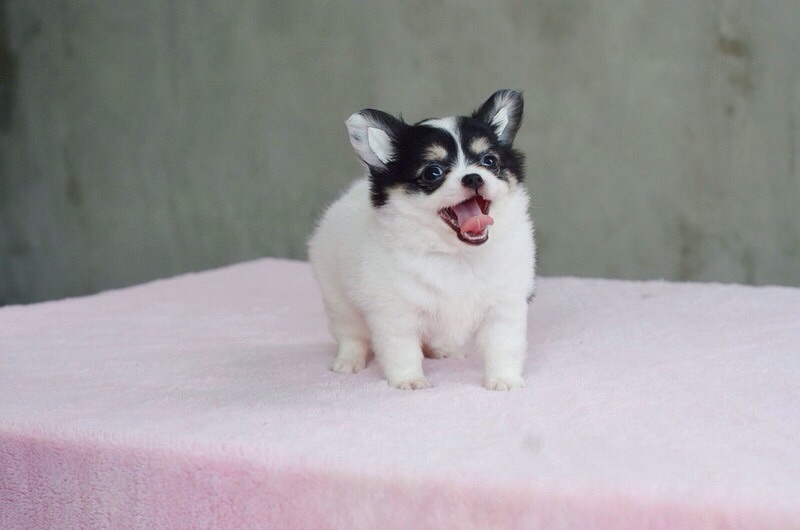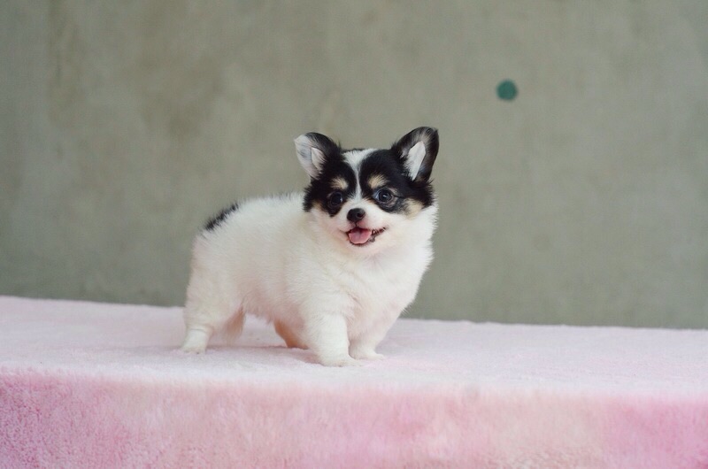 ชิวาวาเพศเมียสีขาวดำมีคิ้วขนยาว ขนแน่นๆ ขาสั้นสวย