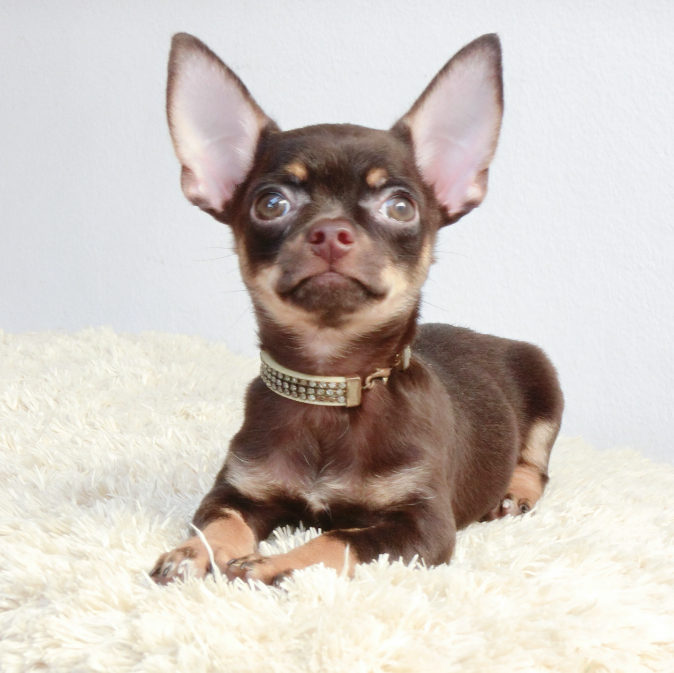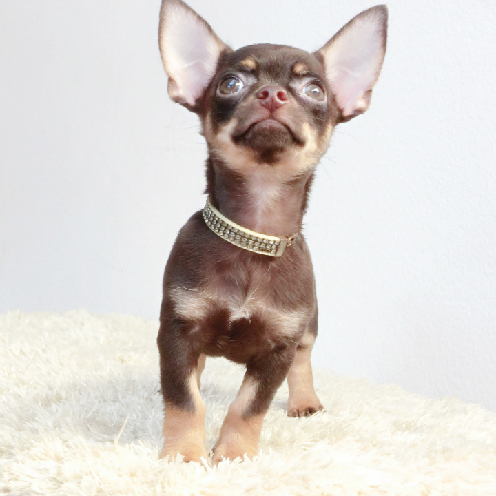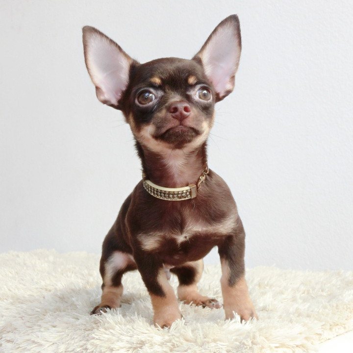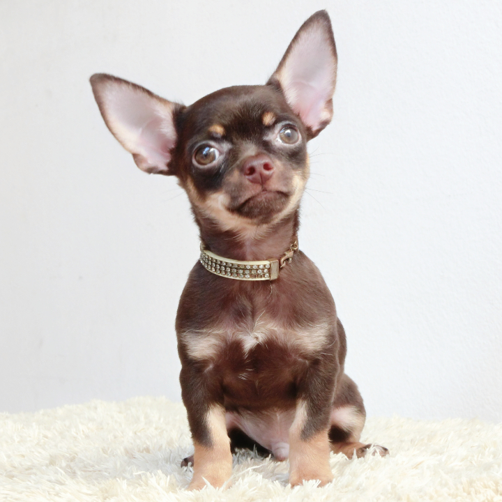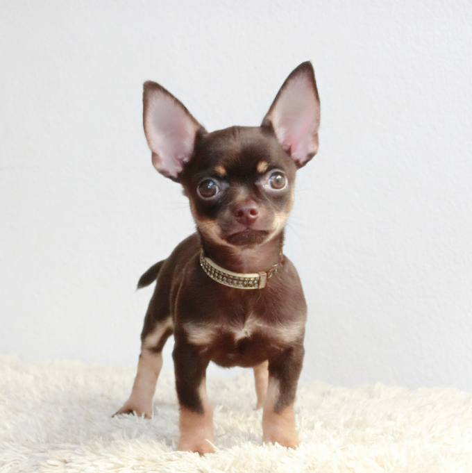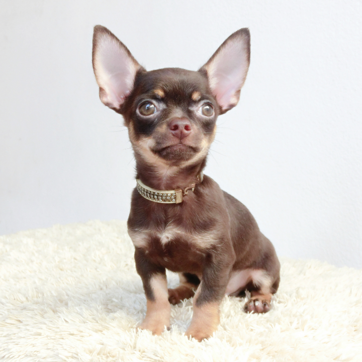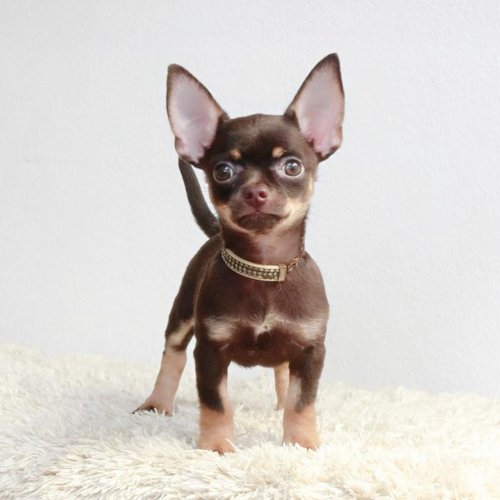 ชิวาวาขนสั้นเพศผู้ ตัวเล็กๆ สีชอคโกแลตแอนด์แทน