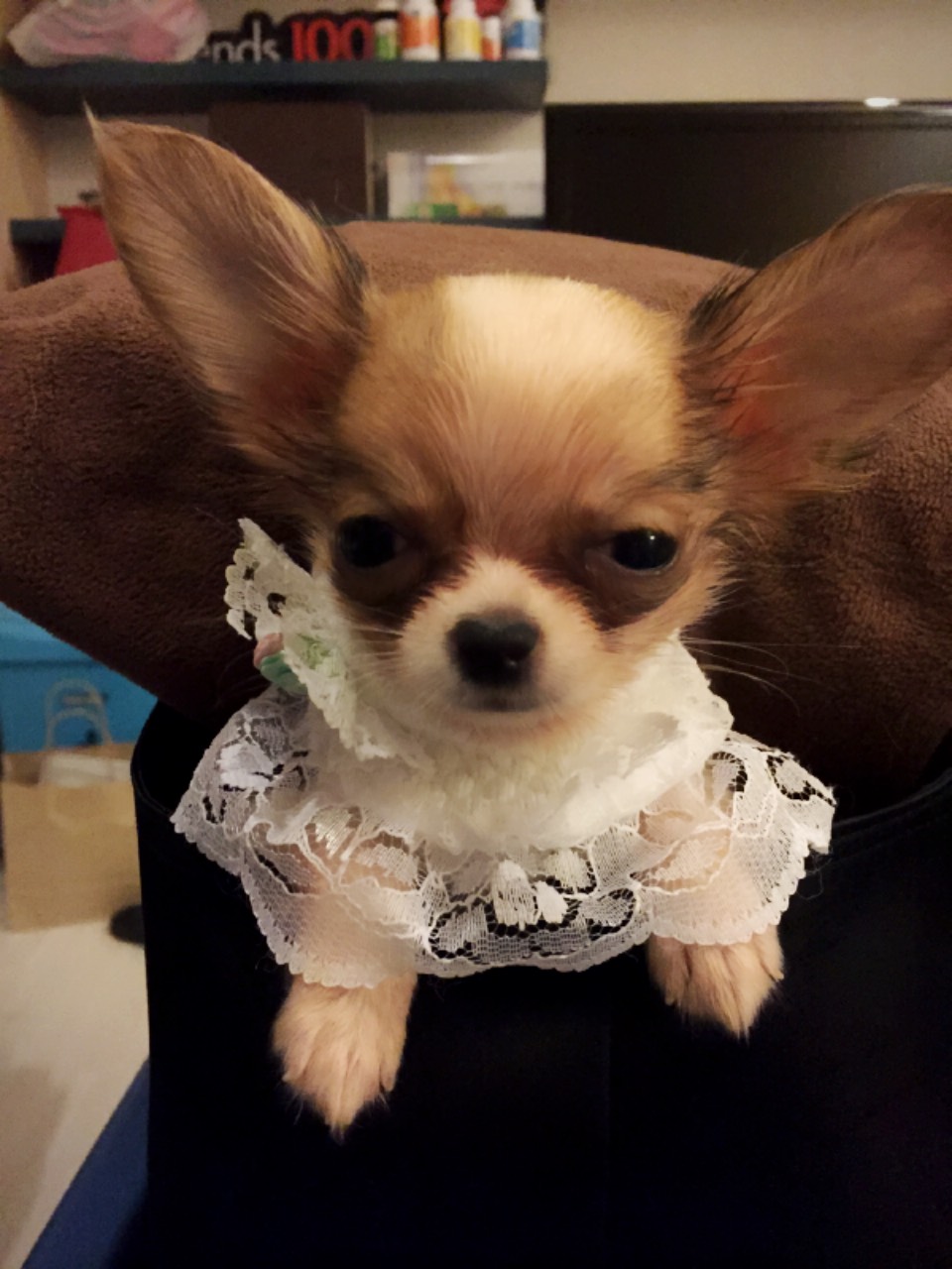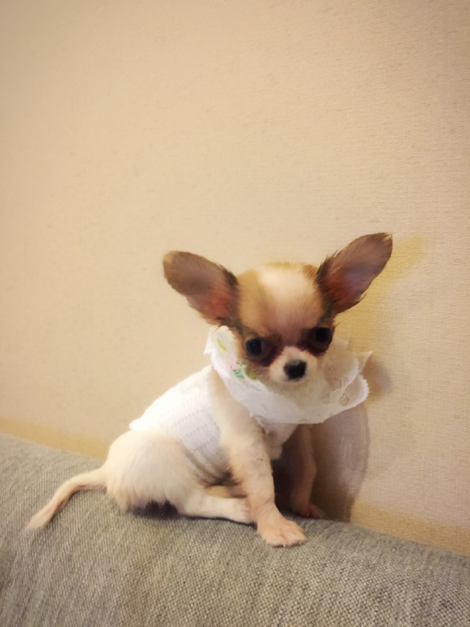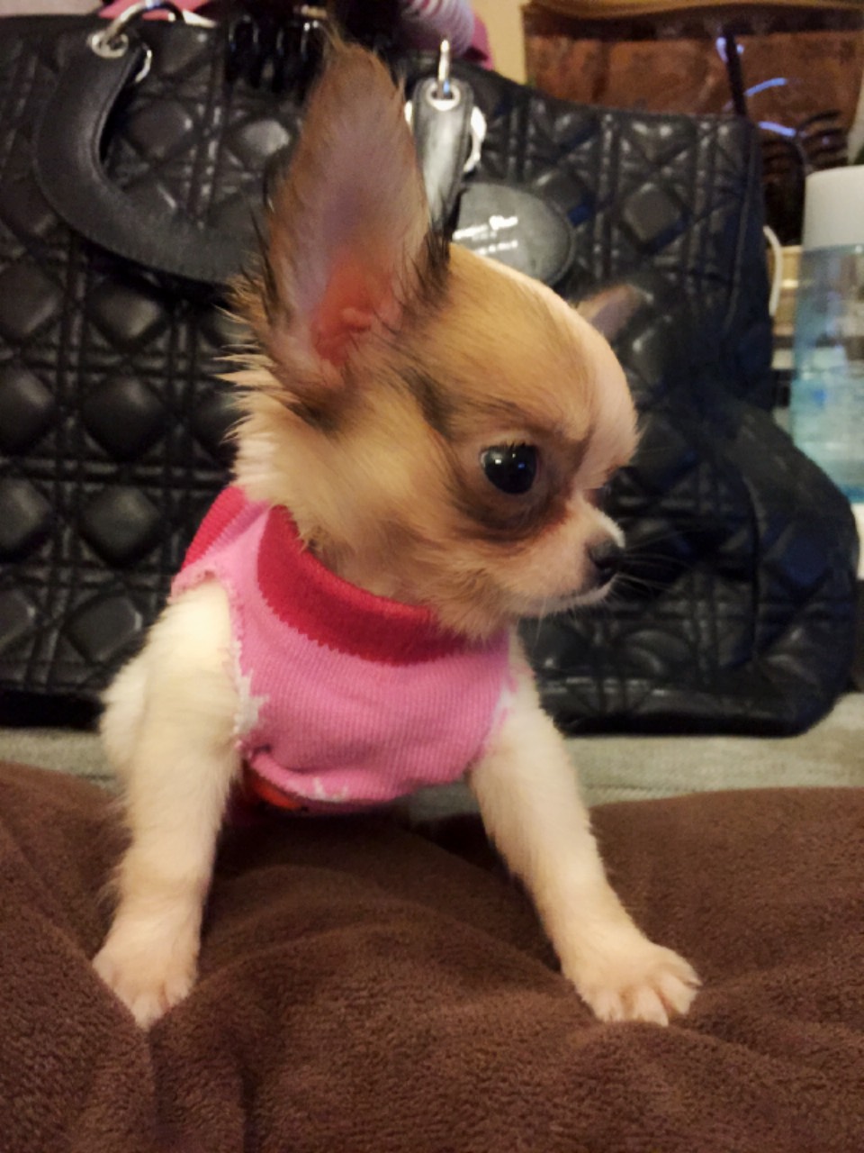 ลูกสุนัข " ชิวาว่า ขนยาว " ไซส์ T-Cup ชุดใหม่ เพศเมีย สี แฟนซี ขาว-น้ำตาล ราคา 18,000 บาท