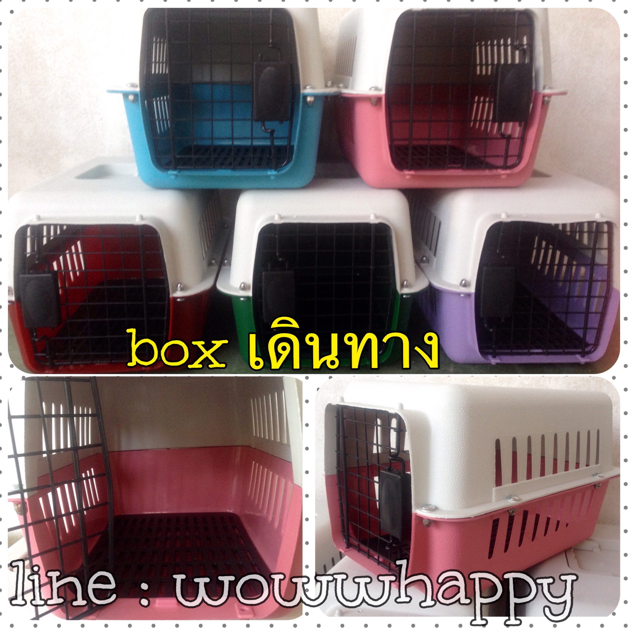 กล่องใส่เดินทางสำหรับสุนัขเล็กค่ะ ของใหม่มือ 1 ไซด์สำหรับใส่สุนัขเล็ก /แมว มี 5 สีตามรูป (ชมพู/ฟ้า/เขียว/แดง/ม่วง) สามารถใช้เดินทางขึ้นเครื่องบินได้ค่ะ ราคาใบละ 350 ... นัดรับเซียร์รังสิต / ฟิวเจอร์รังสิต / เซนทรัลลาดพร้าว หรือ ส่งไปรษณีย์ลงทะเบียนได้ค่ะ (ค่าส่งเพิ่ม 100บาท) สนใจติดต่อ ☎️ 098-8358853 หรือ id line : wowwhappy ค่ะ