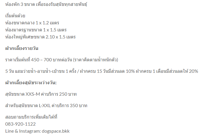 ราคาเริ่มต้นที่ 450 – 700 บาทต่อวัน (ราคาคิดตามน้ำหนักตัว)
