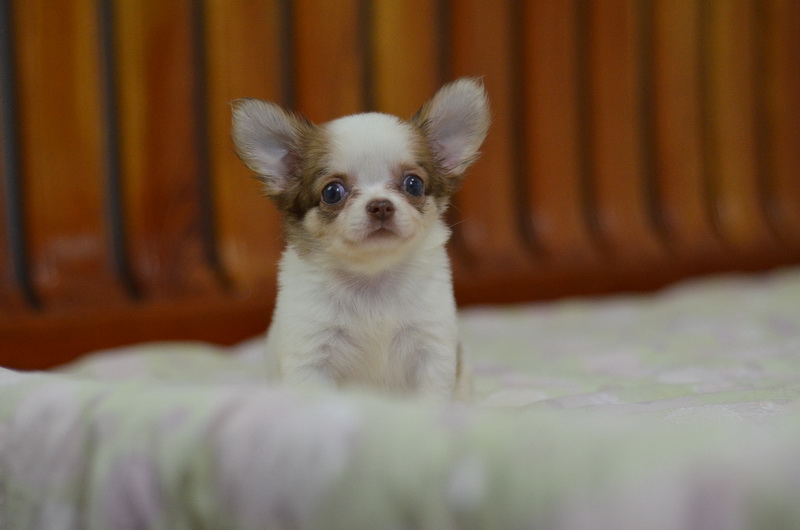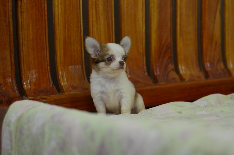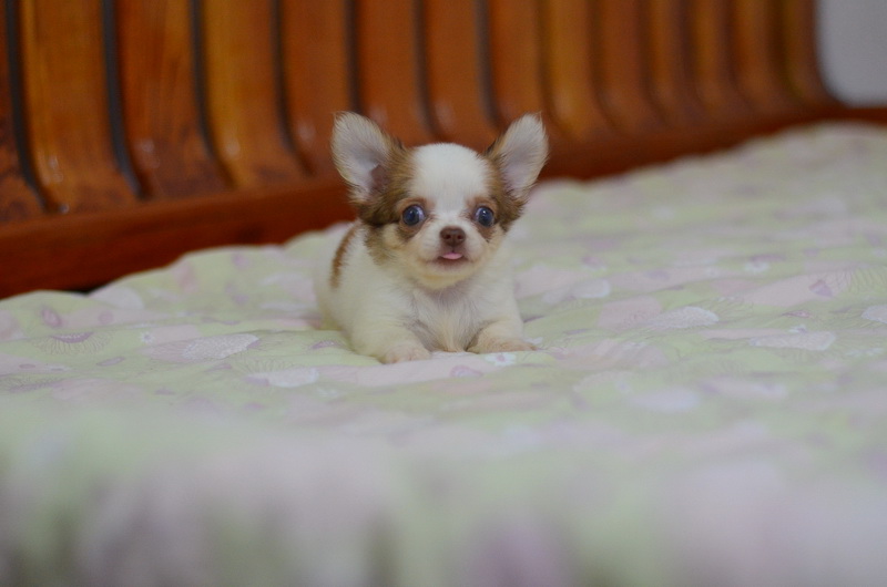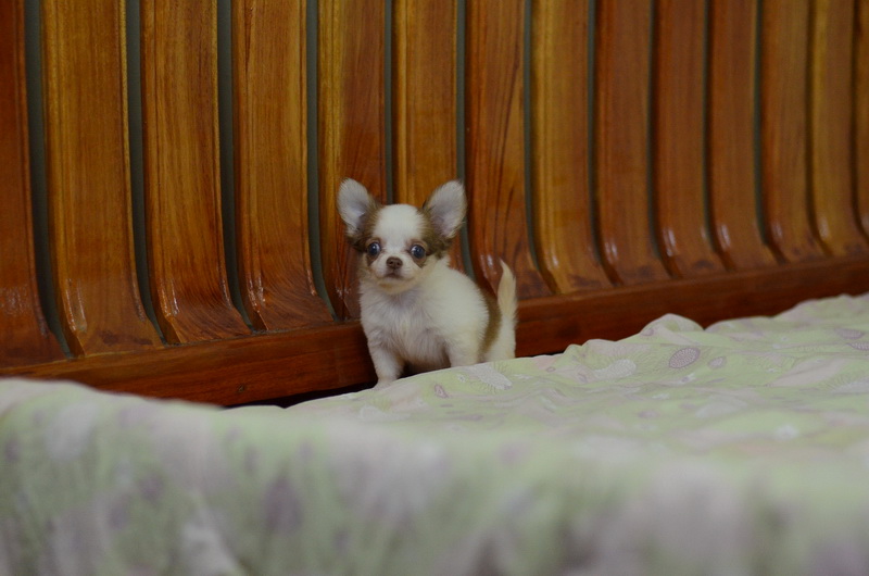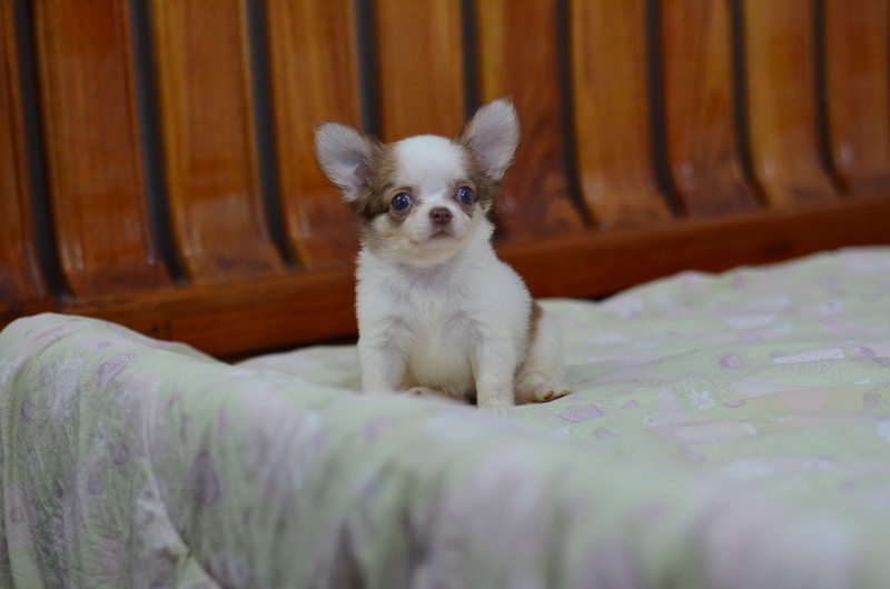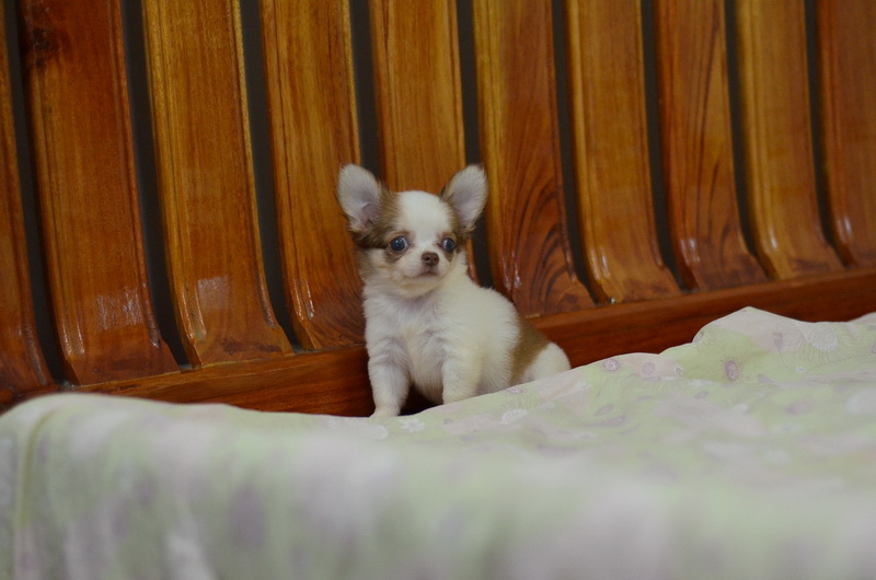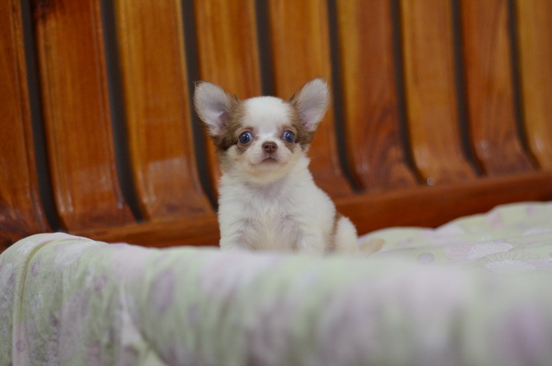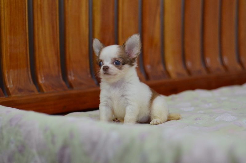 BanMaaYimWaan..บ้านหมายิ้มหวาน... ชิวาวาเพศเมีย ขนยาว สีขาวน้ำตาลชอคโกแลต 8500