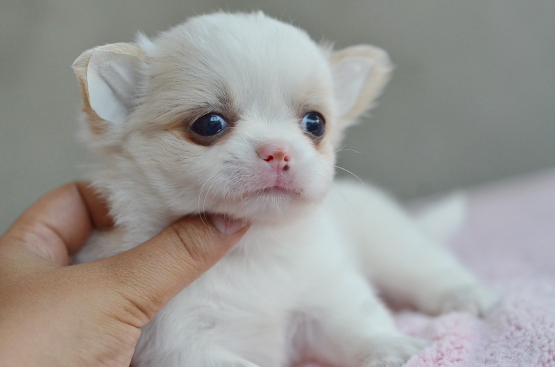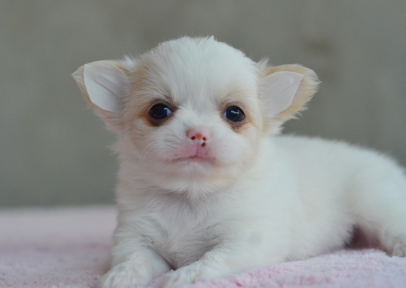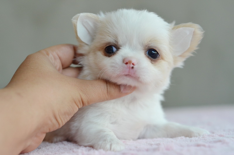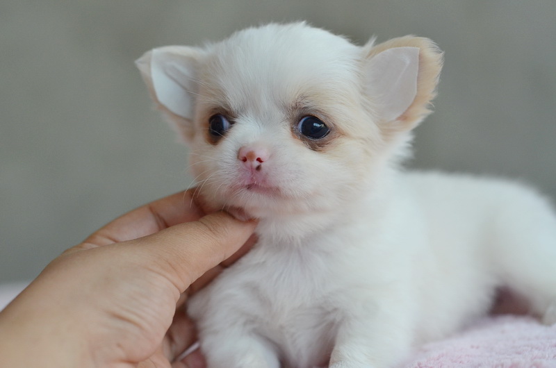 ชิวาวาเพศเมียขนยาวสีขาวครีม หน้าสั้น สวยหวาน หัวโตกลมน่ารัก ขาสั้นหุ่นสวย ขนแน่นมาก เพดสมาคม ราคา 11000