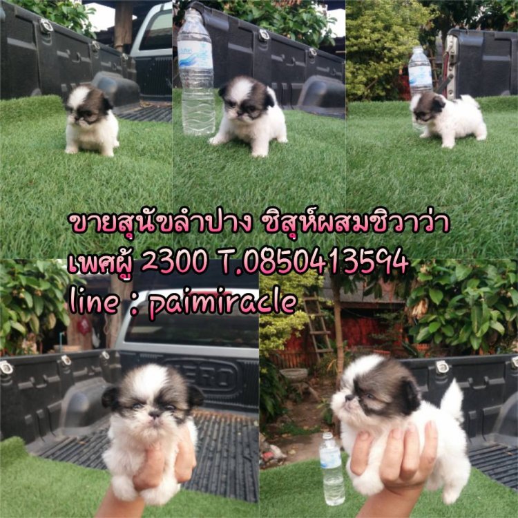 ชิสุห์ผสมชิวาว่า เพศผู้สีสวยน่ารักตัวนี้ตัวเล็กสุด แข็งแรง เกิด 19 กุมภาพันธ์ 59 ถ่ายพยาธิแล้วจ๊ะพร้อมย้ายบ้านลูกค้าที่อยู่ลำปางหรือจังหวัดใกล้เคียงมาดูเด็กๆได้ที่บ้านข้างเซนทรัลลำปางทางเรามีบริการจัดส่งและส่งทางเครื่องบิน (ตัวจริงตัวไม่โตนะค่ะรูปถ่ายใกล้ เทียบกับขวดน้ำสิงห์ขวดกลางขนาด 750 ml ค่ะ) มีคลิปสามารถแอดไลน์มาขอดูคลิปได้นะค่ะ