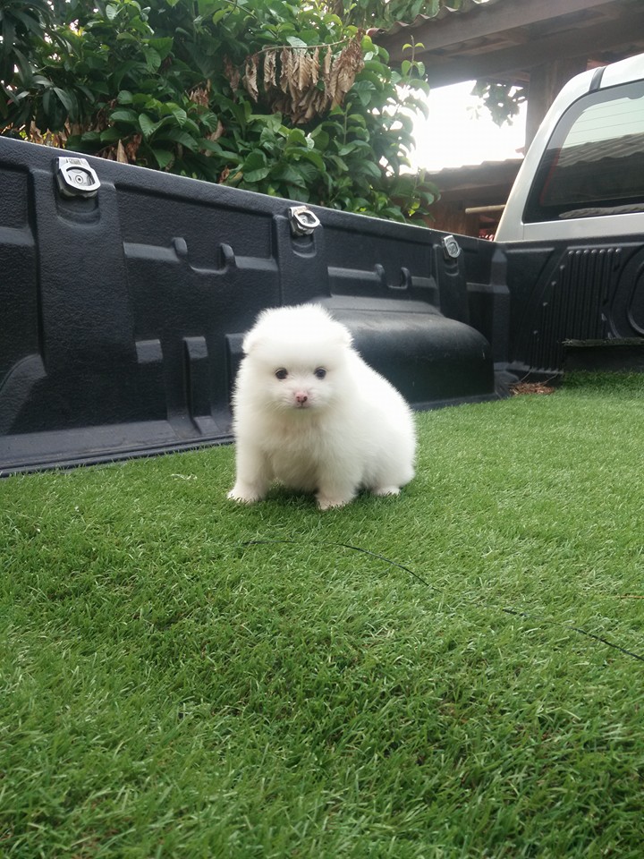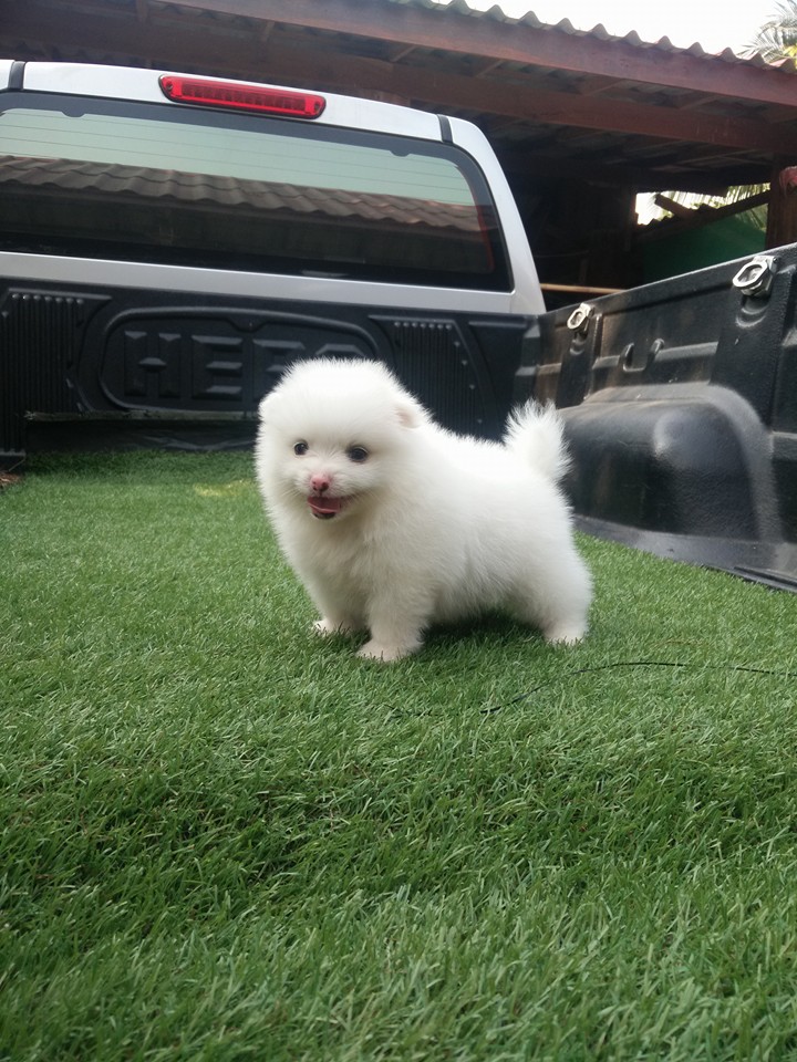 ปอมเพศผู้ตัวที่ 2 สีขาว ฟอร์มเลี้ยงเล่นไซต์มาตราฐาน[มีรูปพ่อแม่] เกิด 23 มีนาคม 2559 แข็งแรงทานอาหารเองได้แล้ว พร้อมย้ายบ้าน ลูกค้าที่อยู่ลำปางหรือจังหวัดใกล้เคียงมาดูเด็กๆได้ที่บ้านข้างเซนทรัลลำปางทางเรามีบริการจัดส่งและส่งทางเครื่องบิน