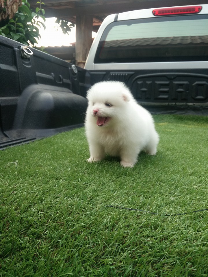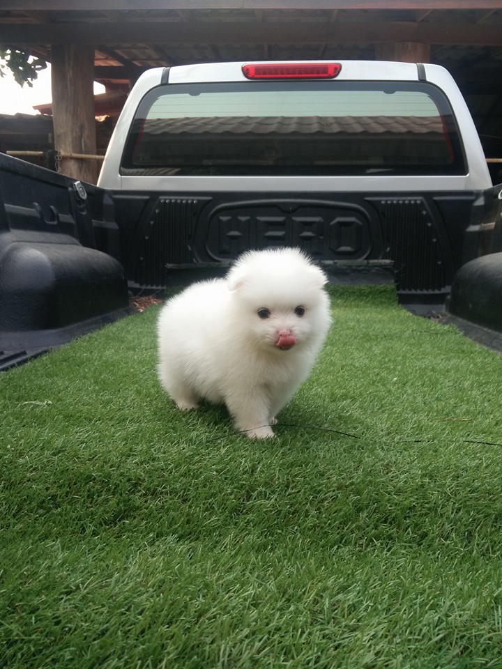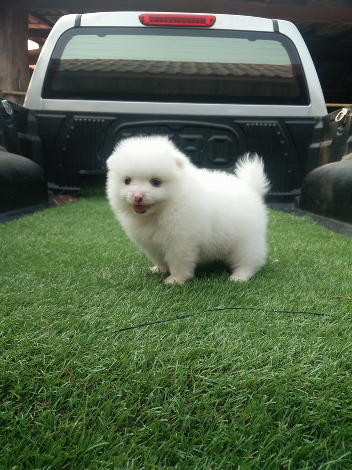 ปอมเพศผู้ตัวที่ 2 สีขาว ฟอร์มเลี้ยงเล่นไซต์มาตราฐาน[มีรูปพ่อแม่] เกิด 23 มีนาคม 2559 แข็งแรงทานอาหารเองได้แล้ว ฉีดวัคซีนรวมเข็มแรก พร้อมย้ายบ้าน ลูกค้าที่อยู่ลำปางหรือจังหวัดใกล้เคียงมาดูเด็กๆได้ที่บ้านข้างเซนทรัลลำปางทางเรามีบริการจัดส่งและส่งทางเครื่องบิน