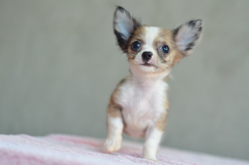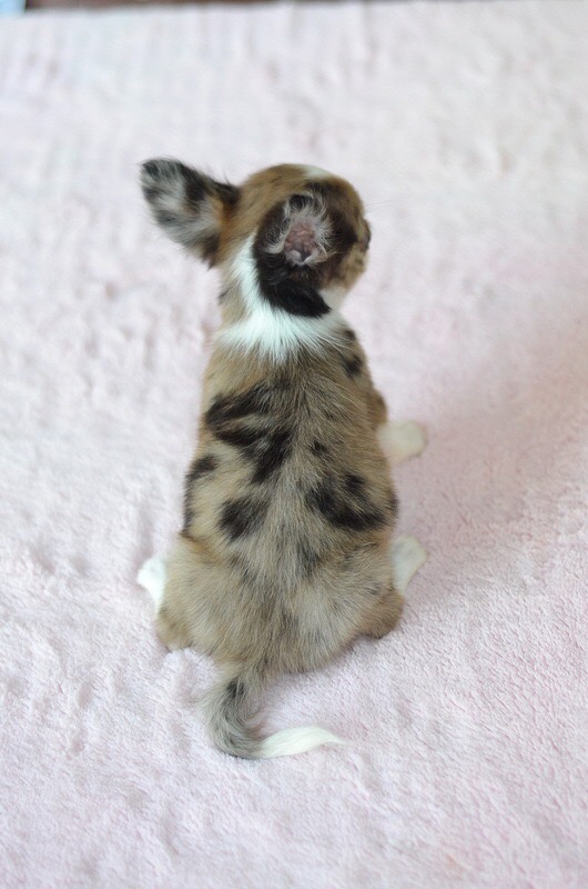 ชิวาวาเพศเมียขนยาวสีเมอร์ ลายสวย มาร์กกิ้งสวยมีถุงเท้าขาว หน้ากากขาว ขาสั้นหุ่นสวย เพดสมาคม ราคา 11000