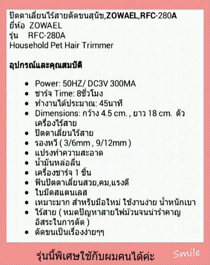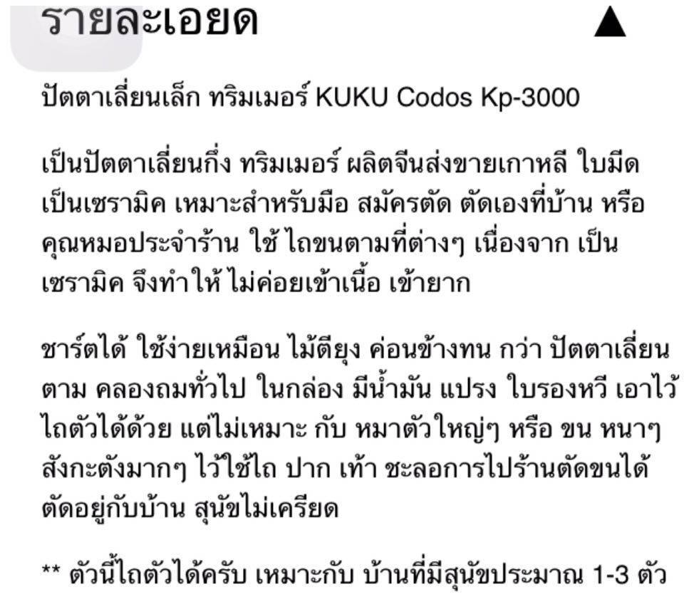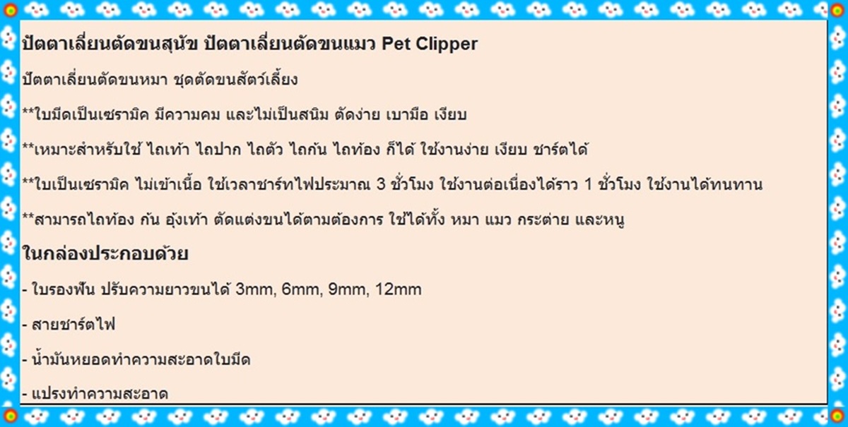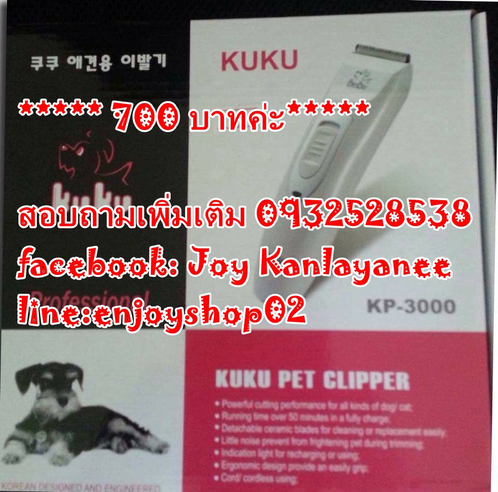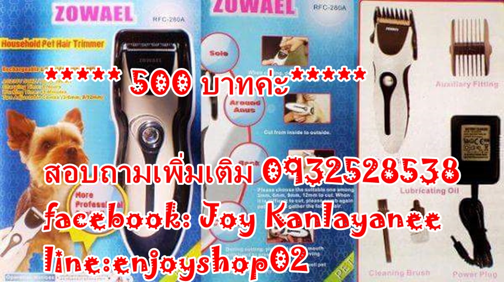 ปัตตาเลี่ยนตัดขนน้องหมา สัตว์เลี้ยงตัวโปรดค่ะ ตัดง่าย เสียงไม่ดัง เริ่มต้นที่ราคา 500 บาท ค่าจัดส่งลงทะเบียน 50 บาทค่ะ มีหลายยี่ห้อให้เลือกนะค่ะ หรือจะมาทดลองใช้ที่ร้านก็ได้ค่ะ ร้านอยู่บ้านไร่ สันป่าตอง เชียงใหม่เจ้า สอบถามเพิ่มเติม 0932528538 facebooK ;Joy Kanlayanee line:enjoyshop02 แม่ค้ามีธนาคาร กสิกรไทย กับ ไทยพาณิชค่ะ