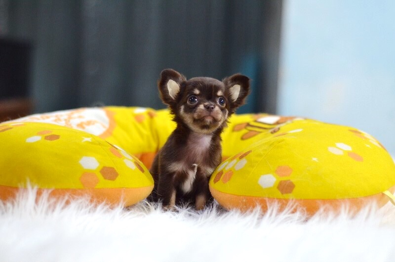 น้องมุ้งมิ้ง ชิวาวาเพศเมียสีชอคโกแลตขนยาว มีคิ้วมีถุงเท้าครบ น่ารักมากๆค่ะ