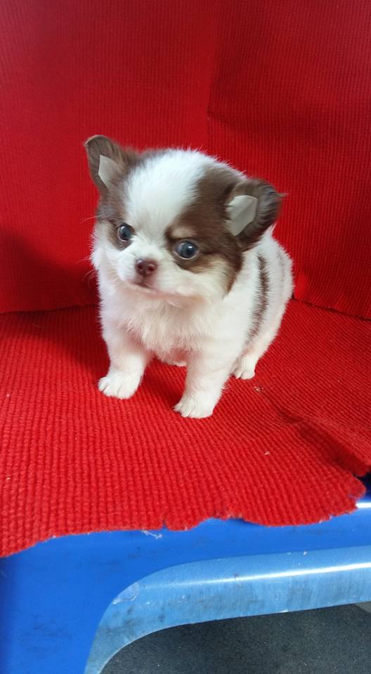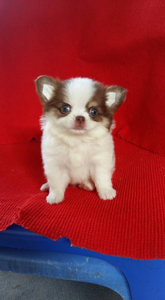ขายลูกชิวาวาขนยาวตัวผู้สีขาวซ็อก 1 ตัวครับลูกหมาที่บ้านเลิ้ยงเองครับ