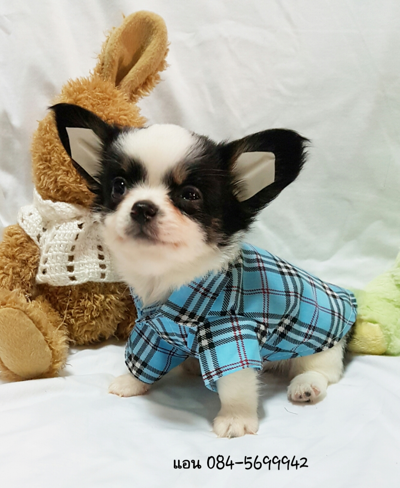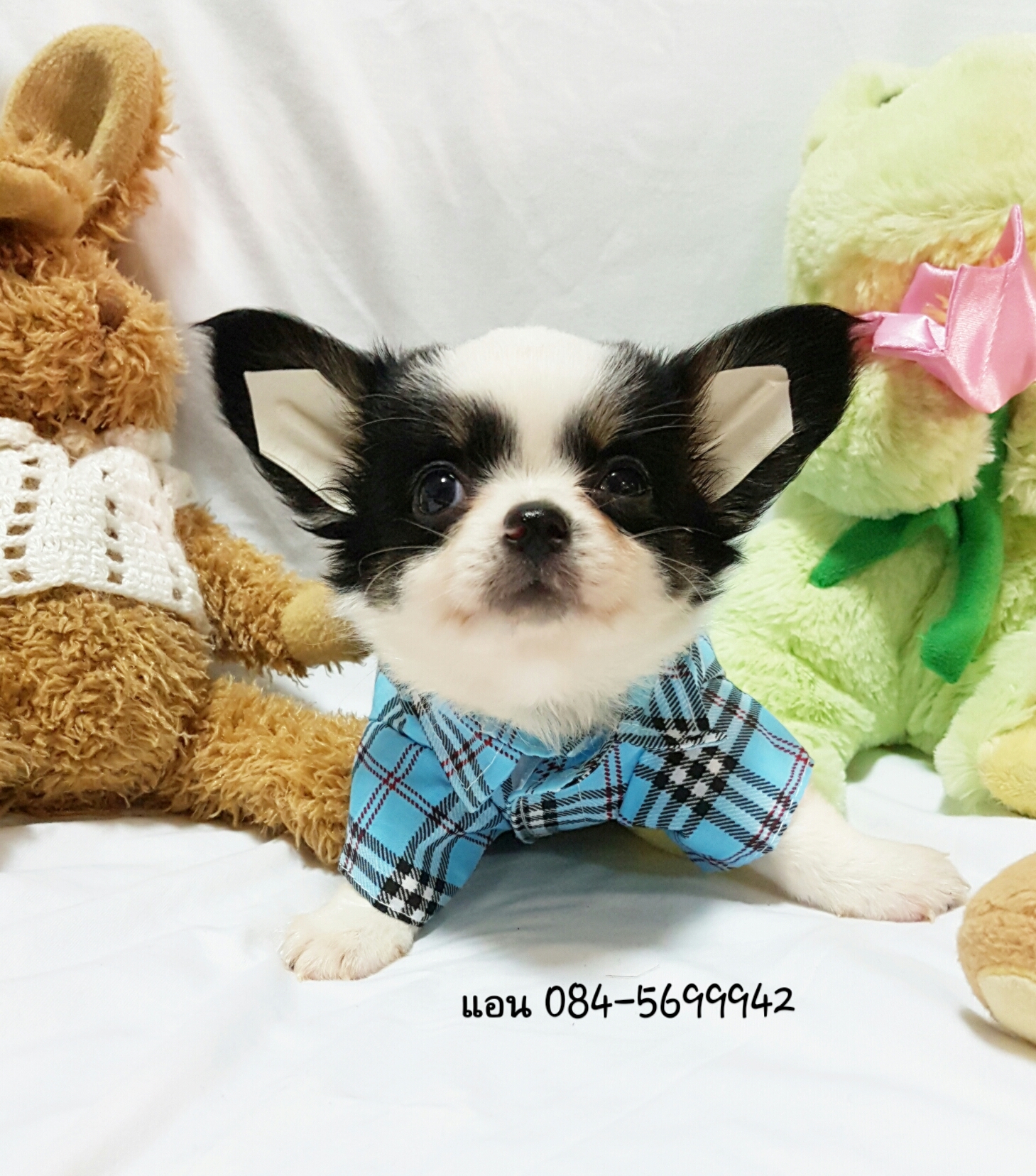 ชิวาวาขนยาว เพศผู้ สีขาวดำ มีคิ้ว น่ารัก อายุ 50วัน แข็งแรง ร่าเริง ปลอดโรค100% ไม่มีเห็บหมัด กินอาหารเม็ดได้แล้ว