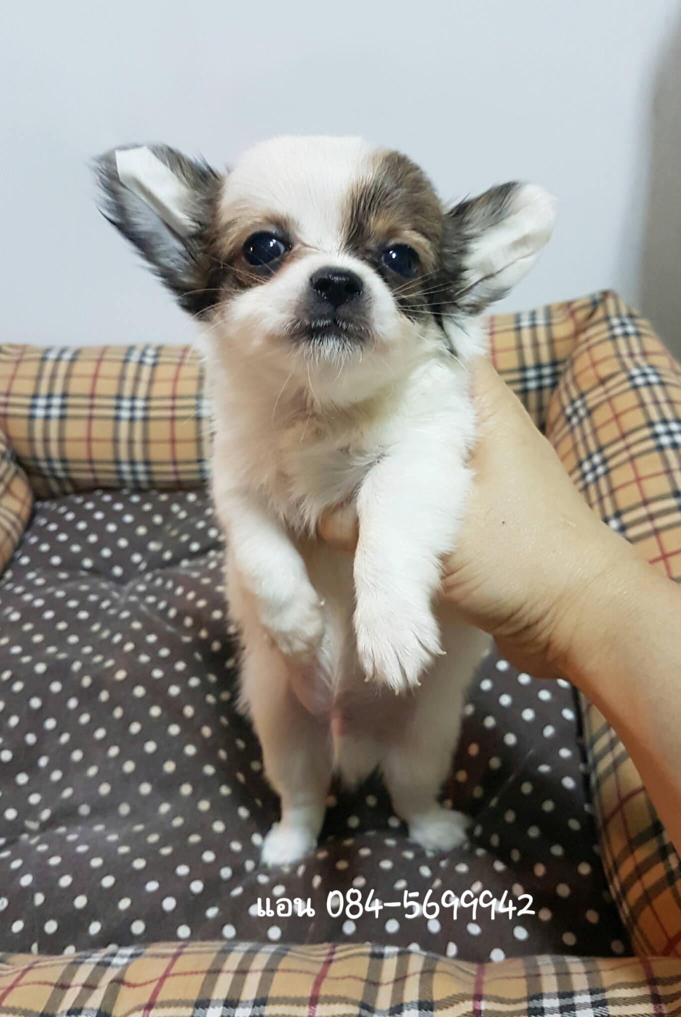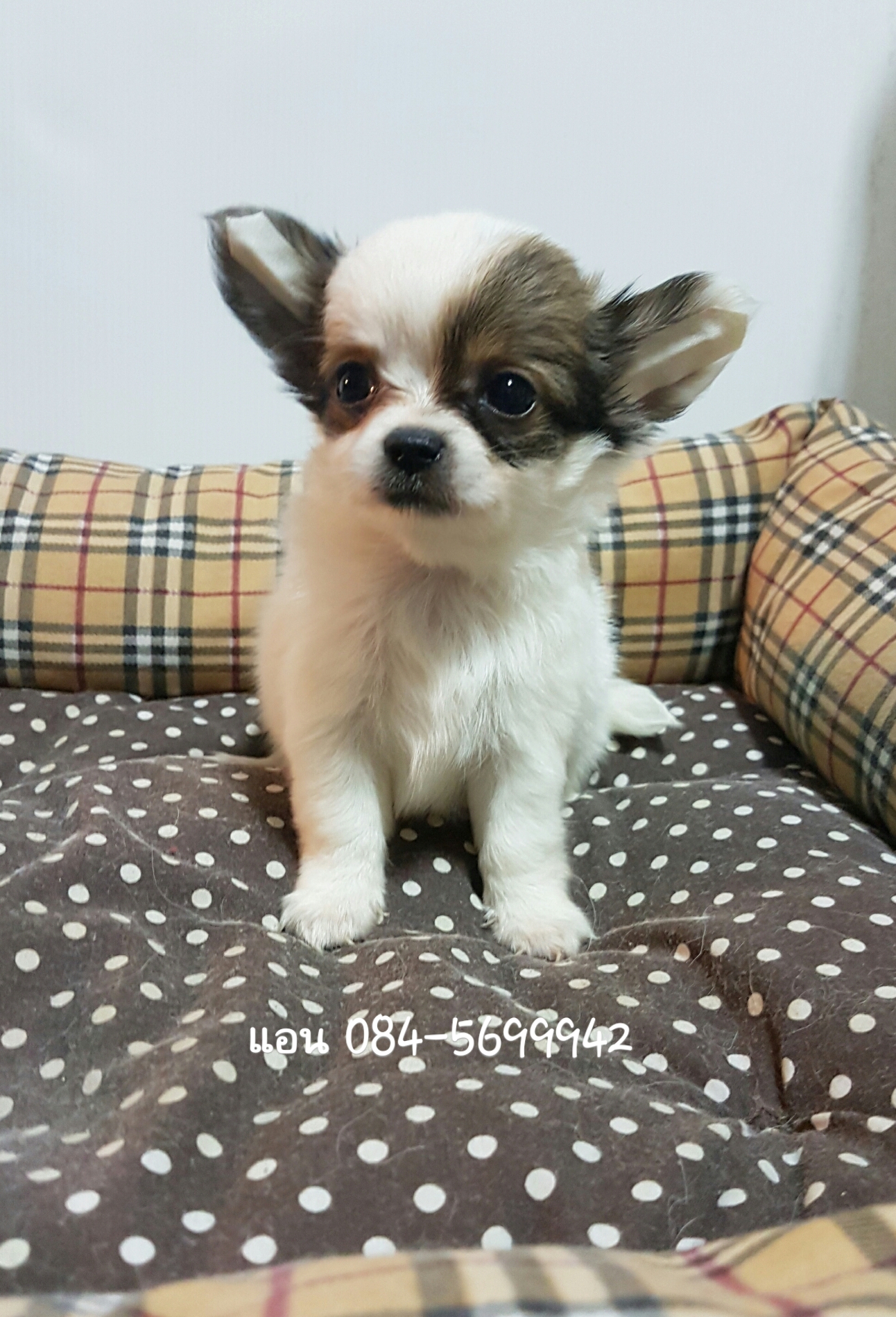 ชิวาวาขนยาว เพศผู้ สีขาวน้ำตาล ไซร์เล็ก อายุ 55 วัน กินอาหารเม็ดได้แล้ว พร้อมย้ายบ้านคะ