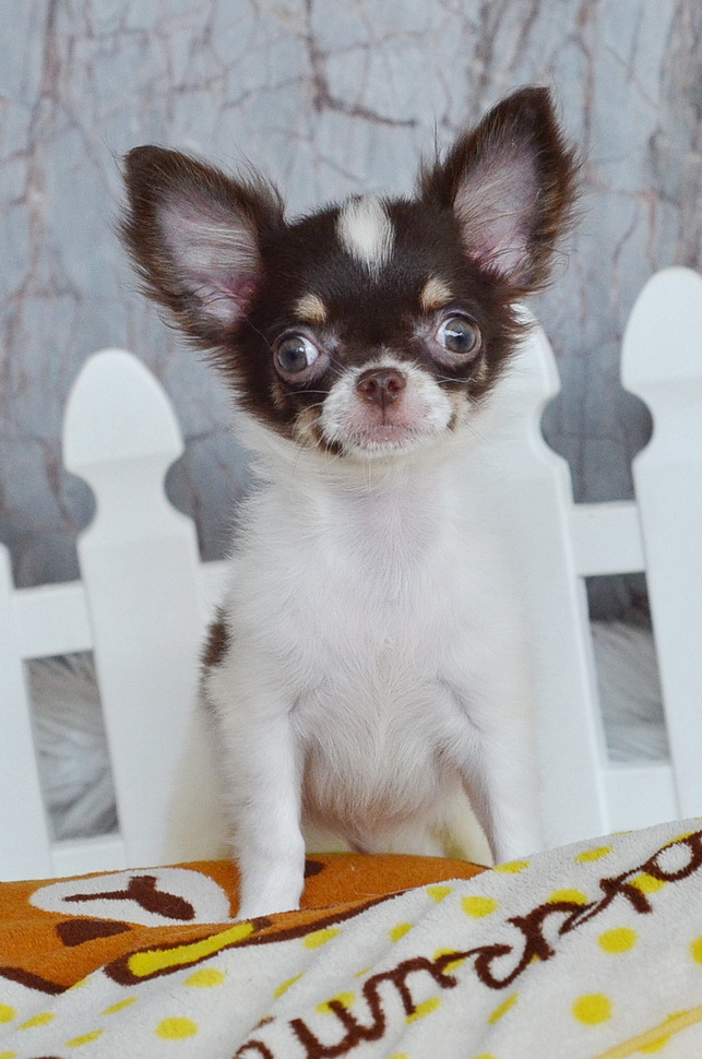 "น้องอีธาน" ชิวาวา เพศผู้ ขนยาว สีขาวชอคโกแลต ราคา 9500 บาท (รูป 3.)