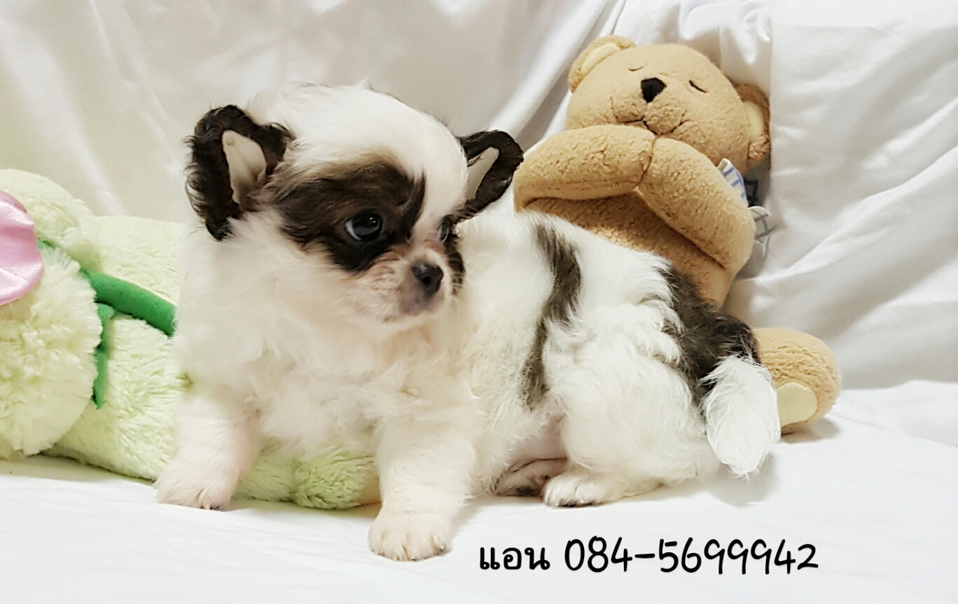 ชิวาวาขนยาว สีขาวน้ำตาล เพศผู้ หน้าสั้น แข็งแรง น่ารัก ฝึกกินอาหารเม็ดได้แล้ว อายุ 2เดือน 10 วัน ลงวัคซีนเข็มแรกแล้ว พร้อมใบเพ็ดสมาคม