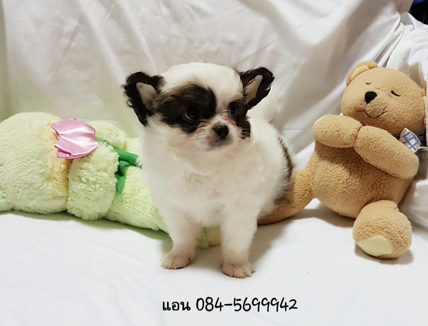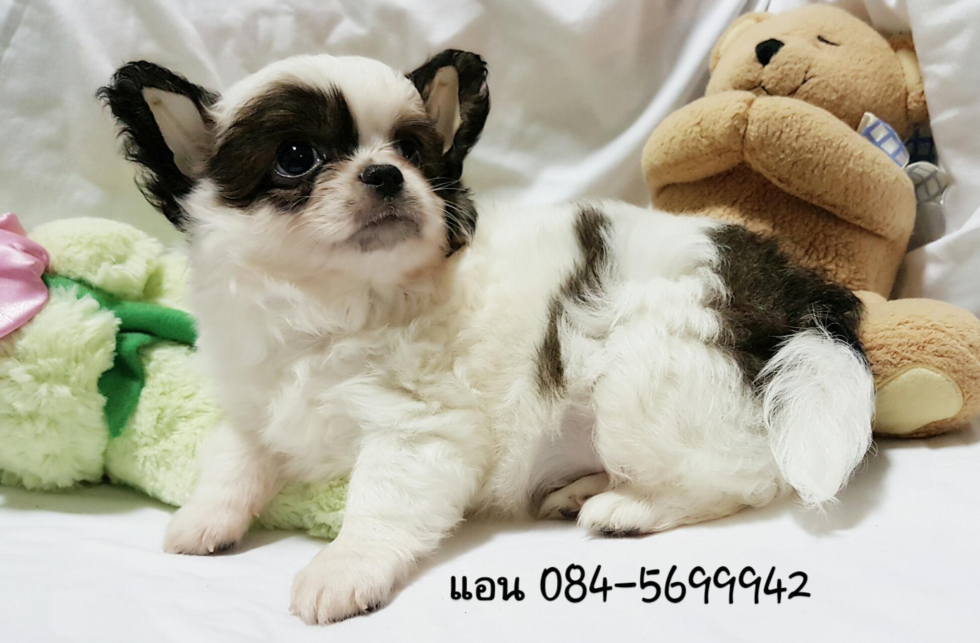 ชิวาวาขนยาว สีขาวน้ำตาล เพศผู้ หน้าสั้น มีใบเพ็ด ลงวัคซีนเข็มแรกแล้ว