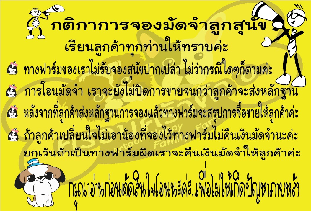 ปล. สุนัขทุกตัวเรารับประกัน 5 วันหลังการขายค่ะ คืนเงินค่าสุนัขเต็มจำนวน(ไม่รวมค่าขนส่ง)