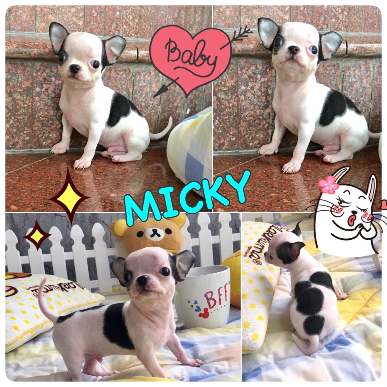 "น้องมังคุด" เพศผู้สีชอคแทนหน้าหล่อ ไซด์เล็ก ราคา 9500. "น้องดอลลี่" เพศเมียสีขาวครีมหน้าหวาน ไซด์เล็ก ราคา 8500 "น้องมิคกี้" เพศผู้ขนสั้นสีขาวดำ ไซด์เล็ก ราคา 11500 บาท