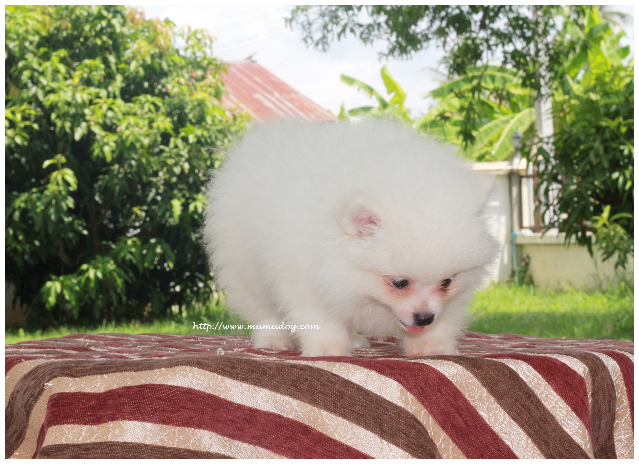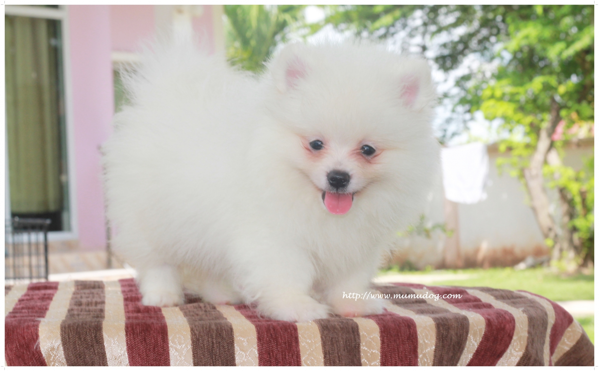 ปอมเมอเรเนียน สีขาว เพศผู้ ขนแน่นๆ ขนพองๆ..หน้าหมี ขาสั้น ขาใหญ่..ร่าเริง ขี้เล่น แข็งแรง กินเก่ง พร้อมย้ายบ้าน