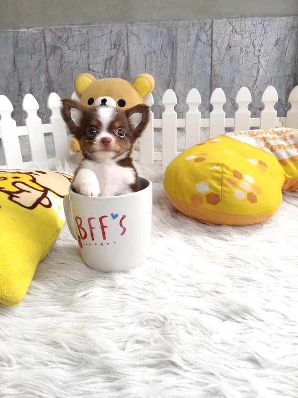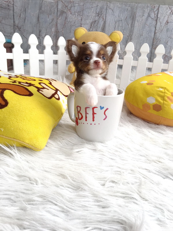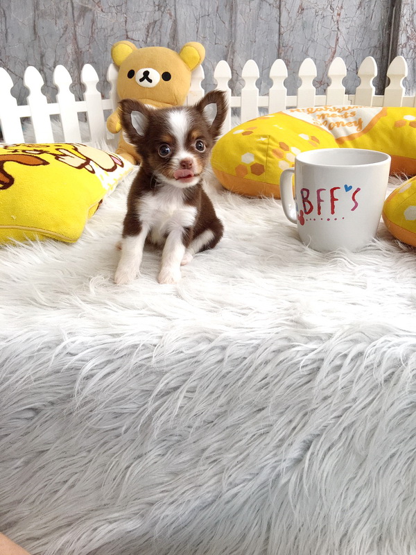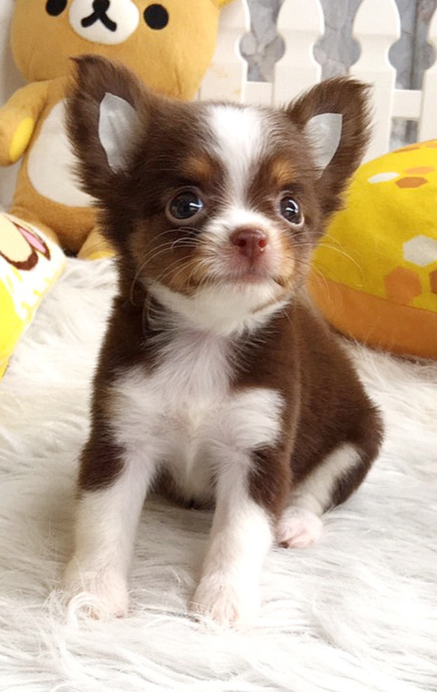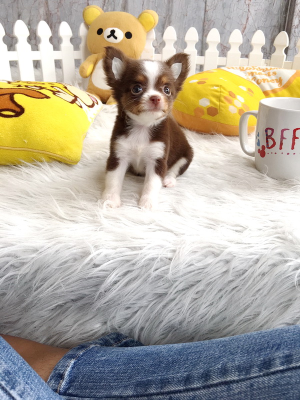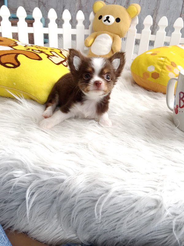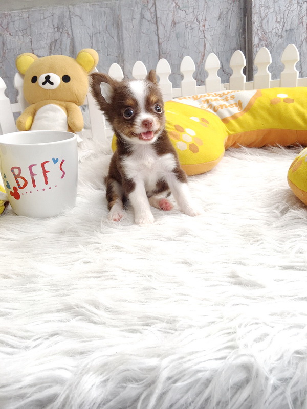 ชิวาวา เพศเมีย ขนยาว สีชอคโกแลตแทนไวท์มาร์ก ราคา 9500 บาท