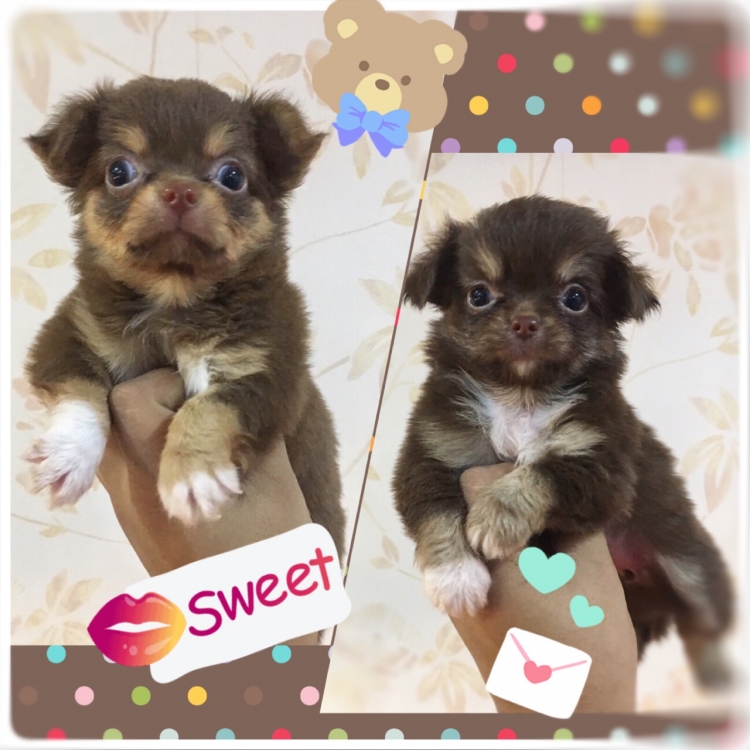 2 ชิวาวาเพศเมีย ขนยาว สีชอคโกแลตแทน ราคาตัวละ 12500 บาท