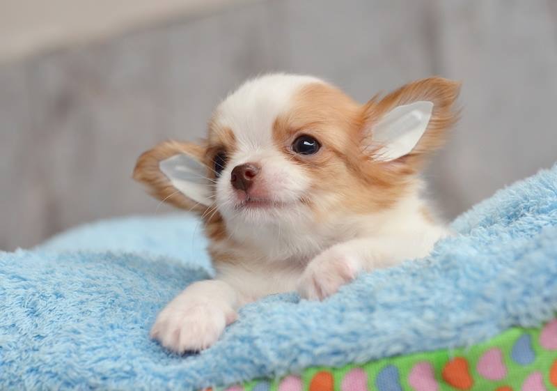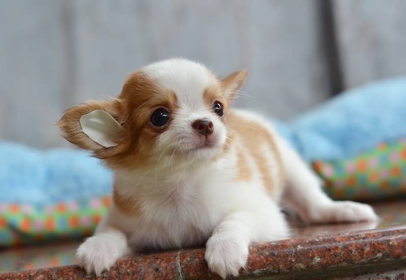 ชิวาวาเพศเมียขนยาวสีขาวน้ำตาล จมูกชมพู สายสีชอค ราคา 8900 บาท