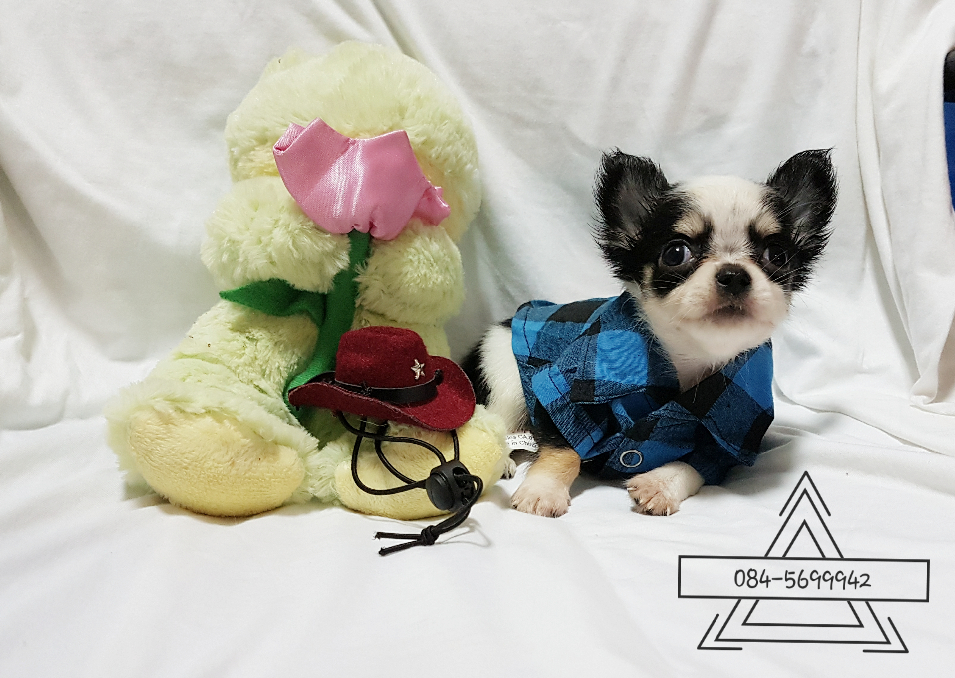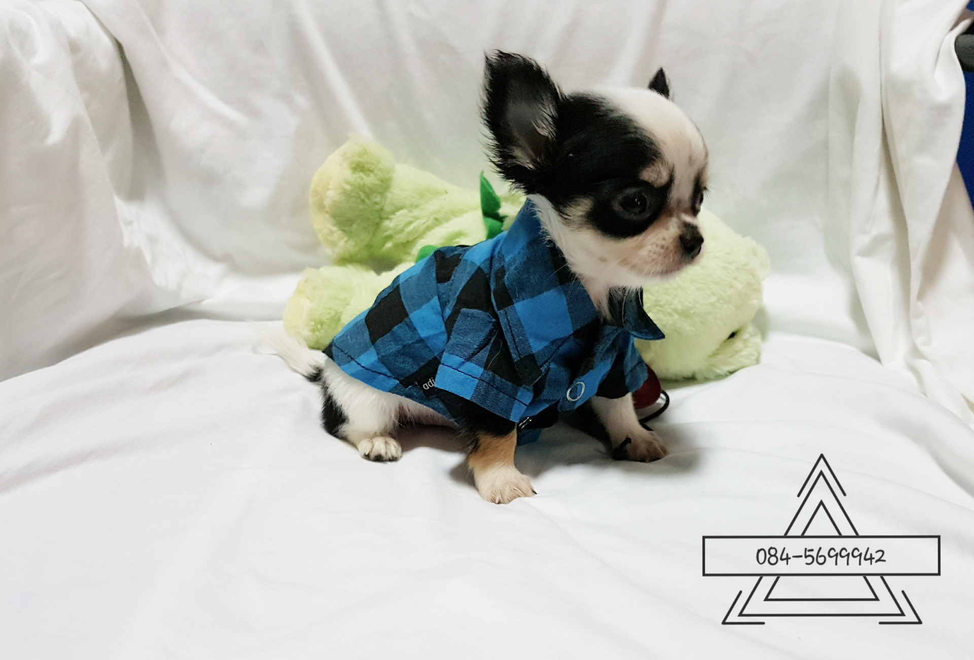 ชิวาวาขนยาว เพศผู้ สีขาวดำ มีคิ้ว ไซร์เล็ก พร้อมย้ายบ้าน