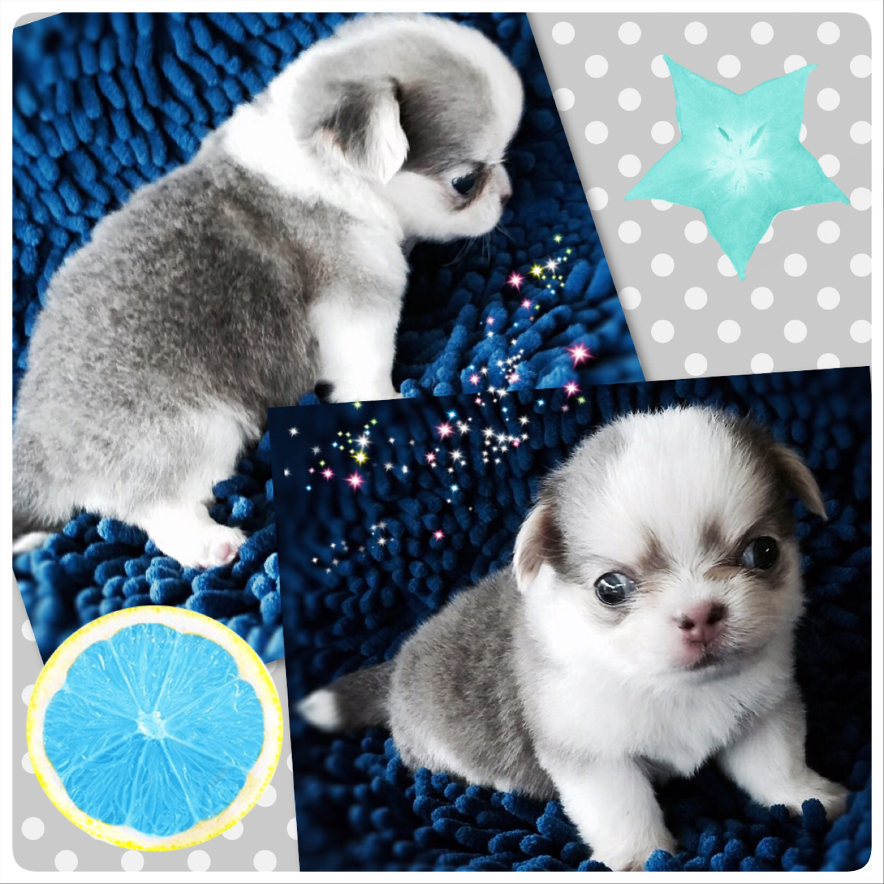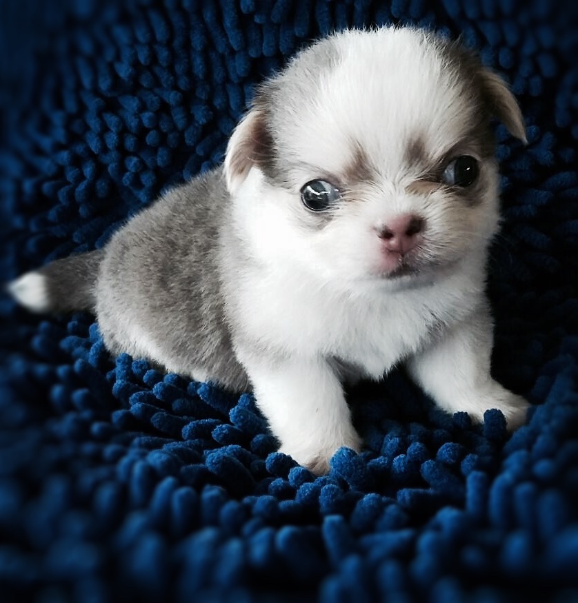 ชิวาวาเพศเมียขนยาวสีเทามาร์กขาว หน้าสั้น สวยมาก ไซด์เล็ก ราคา 13500