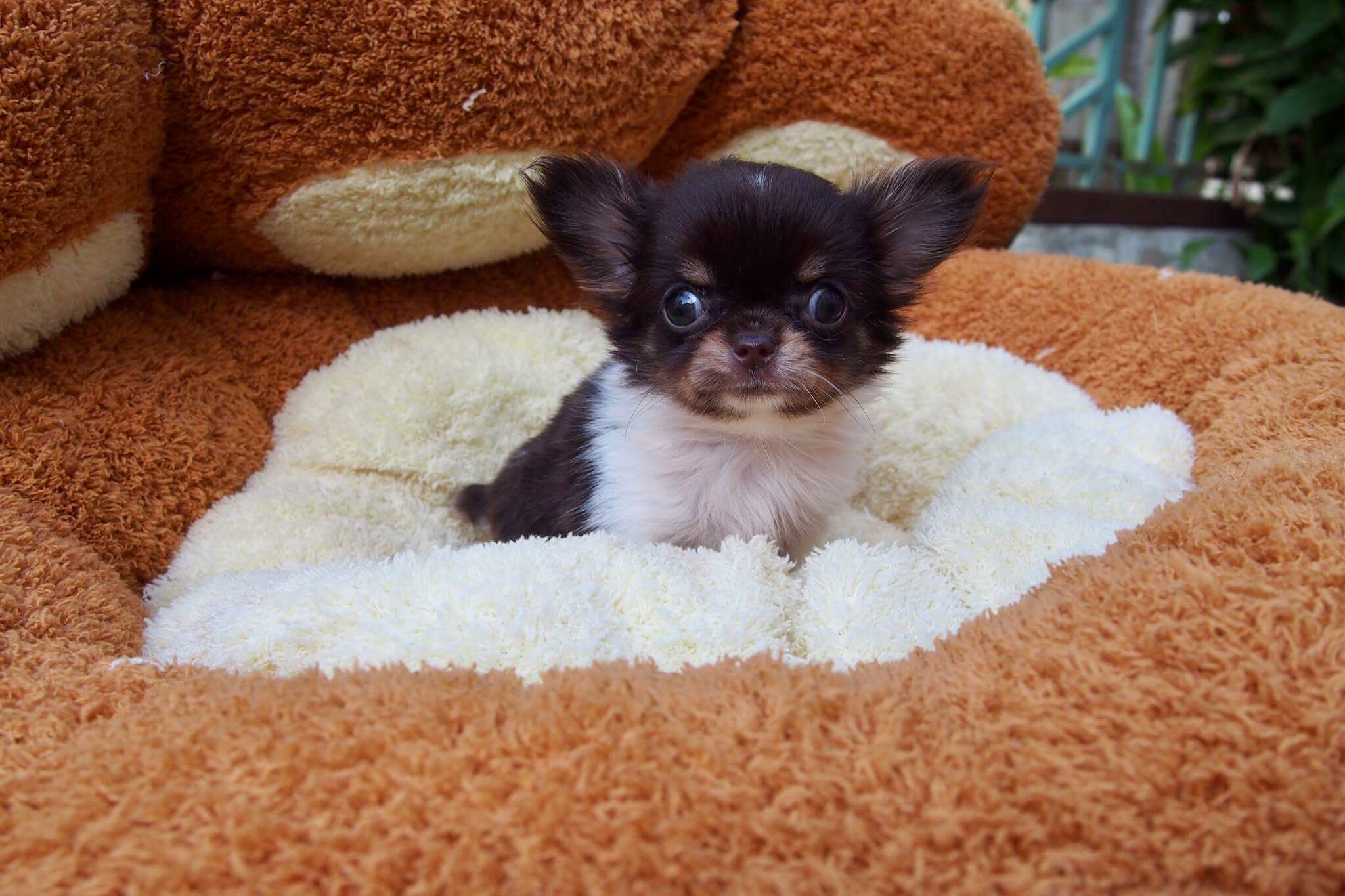 น้องบราวนี่ ชิวาวาขนยาวเพศเมีย สีขาว-ช็อค ไซส์เล็ก หน้าสั้นหัวสวยขนดีมากๆ(6,900)