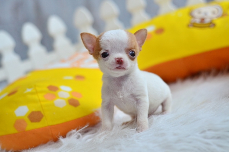 ชิวาวาเพศผู้ขนสั้นสีแฟนซีขาวน้ำตาล