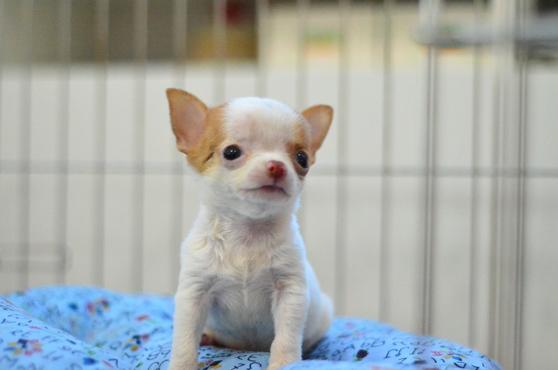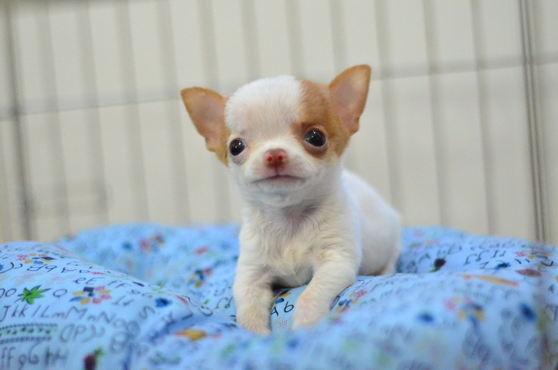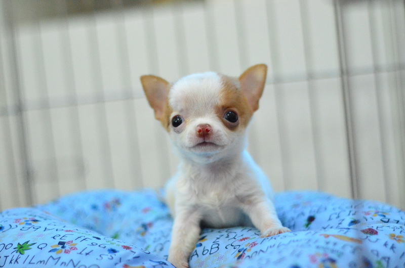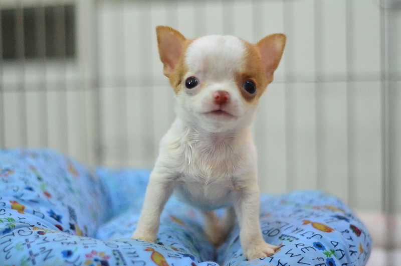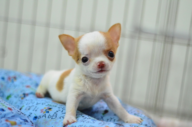 ชิวาวาเพศผู้ขนสั้นสีแฟนซีขาวน้ำตาล
