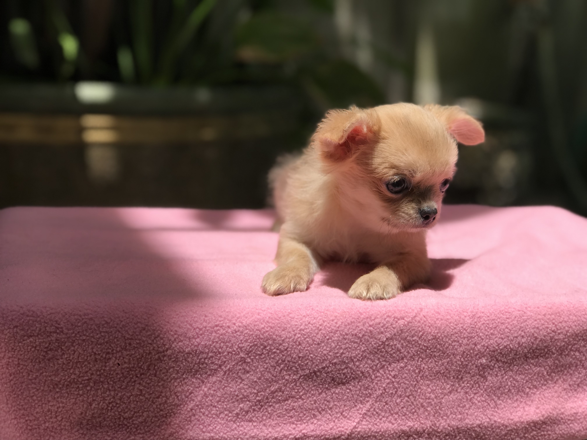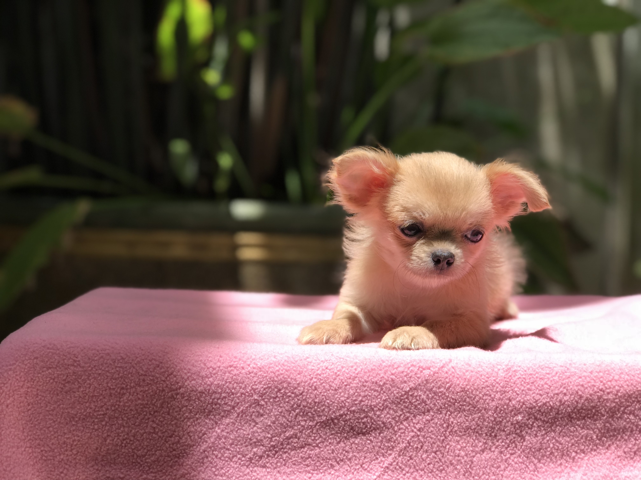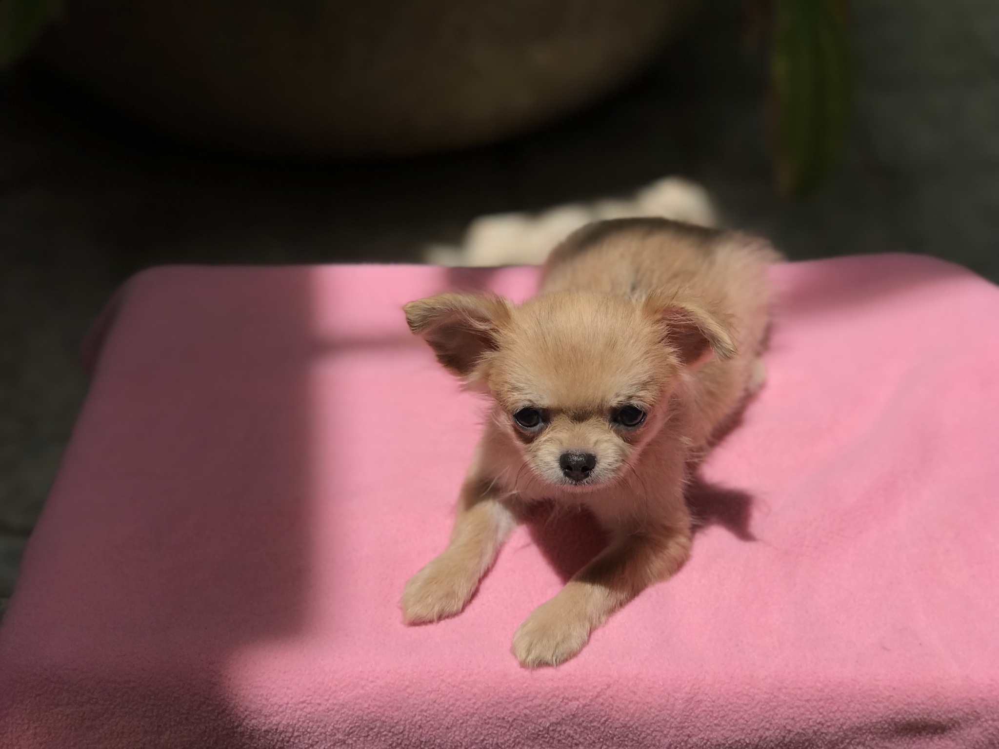 ชิวาวาขนยาวแท้ เพศผู้ สีน้ำตาลอ่อน อมเทา 4,500฿