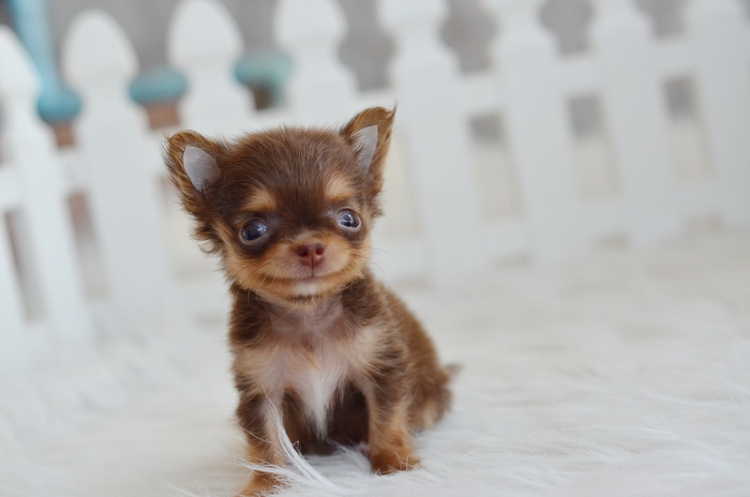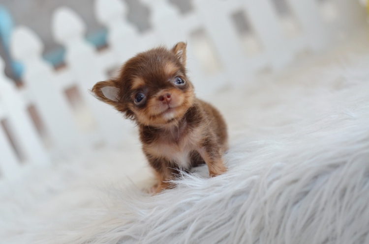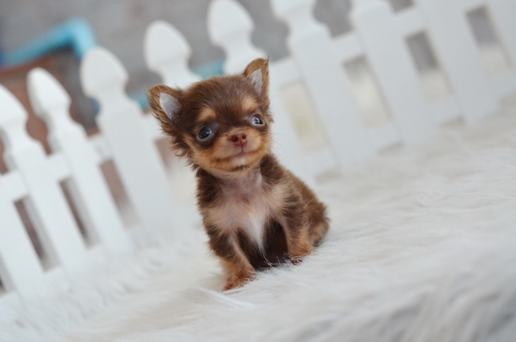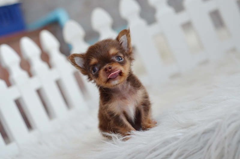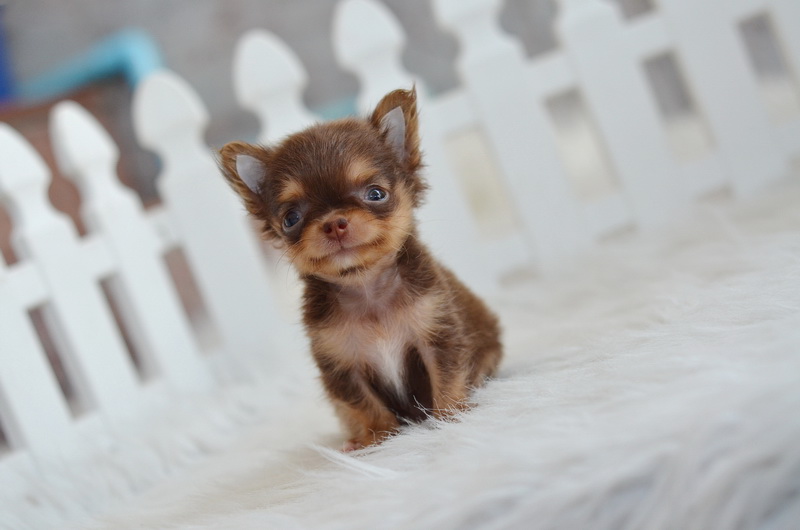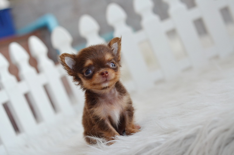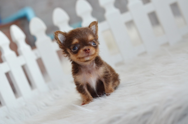 ชิวาวา เพศผู้ ขนยาว สีชอคโกแลตแทน ไซด์ทีคัพ ราคา 12500 บาท