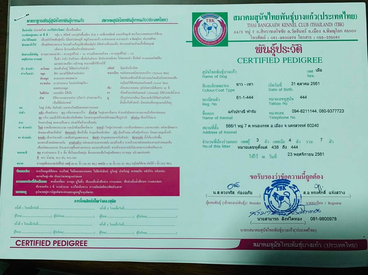 ลูกสุนัขไทยบางแก้ว มีใบพันธุ์ประวัติจากสมาคม
