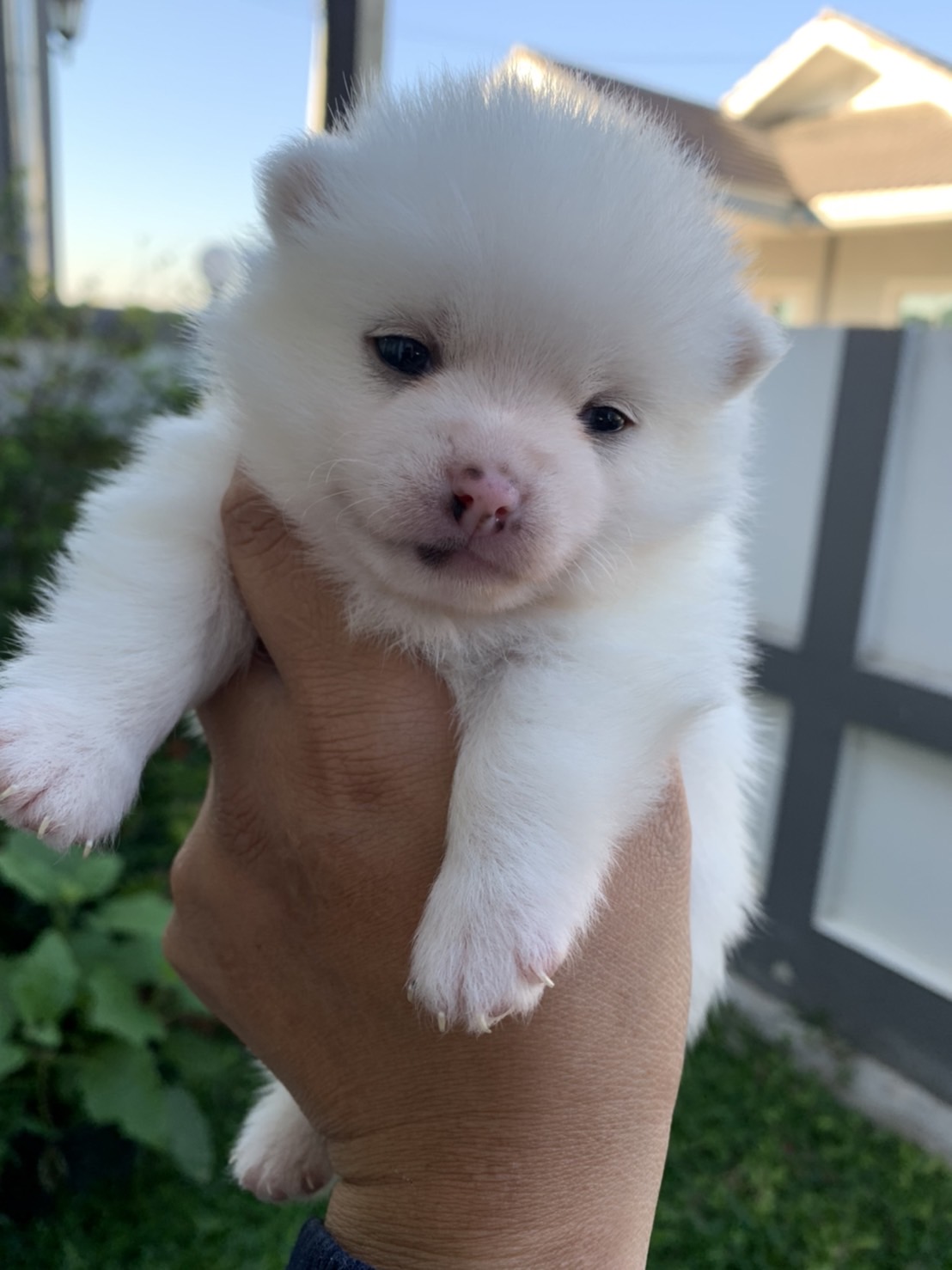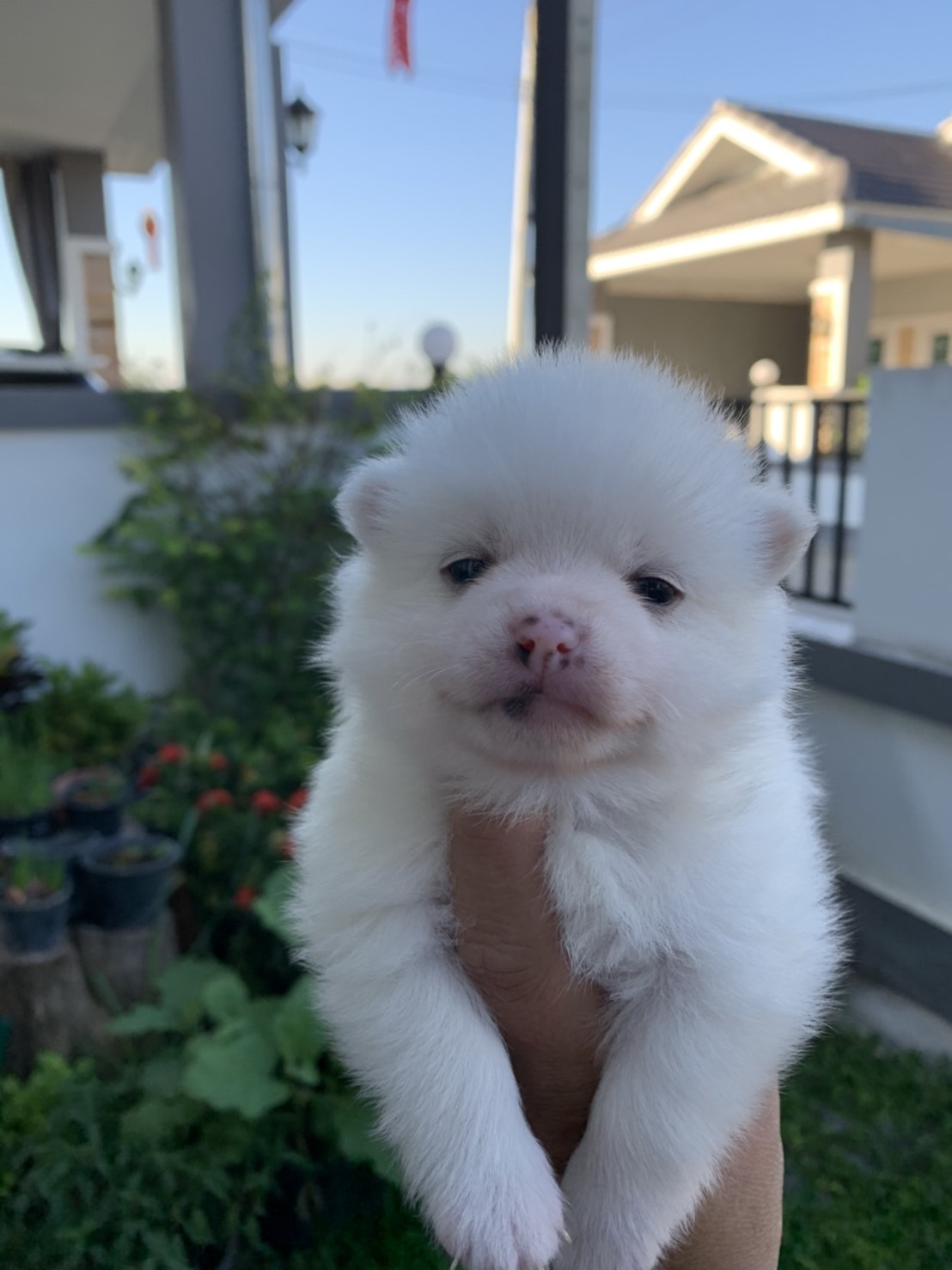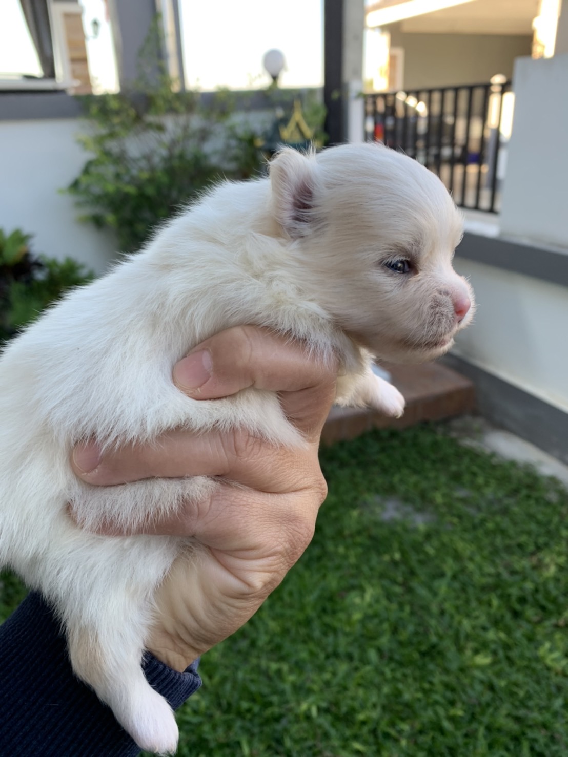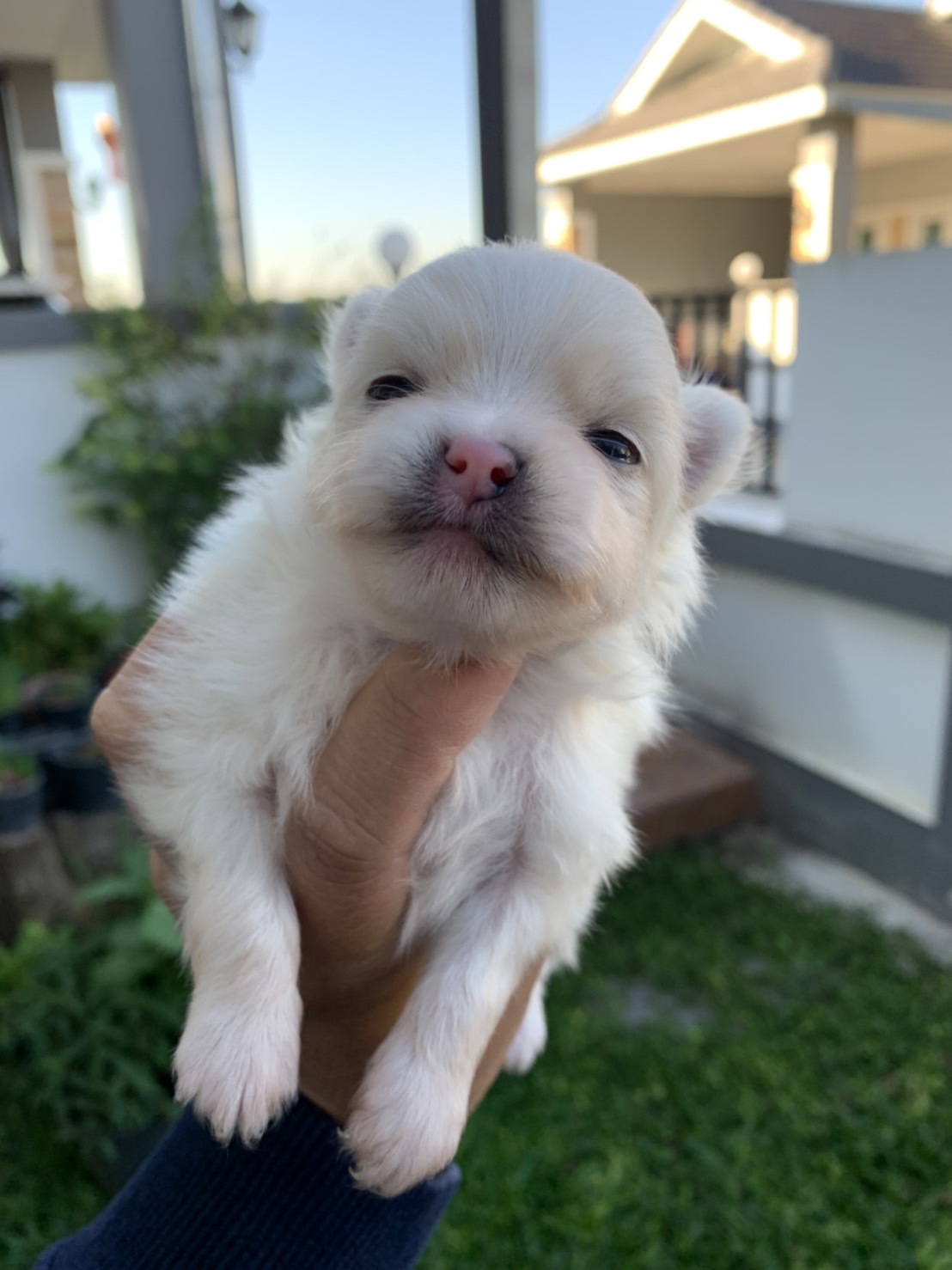 ขายปอมผสมชิวาวา สีขาว ผู้ 2 ราคา 4200 อายุได้ 20กว่าวัน