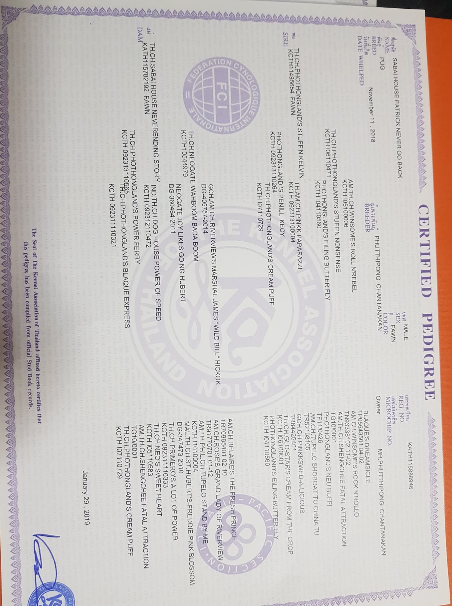 ปั๊กลูกพ่อ+แม่ไทยแชมป์ เพศผู้ อายุ7เดือน เพ็ดดีกรีเต็มใบ4เจน พร้อมย้ายบ้าน เกิดวันที่ 11/11/2018 วัคซีน+ถ่ายพยาธิ ครบตามโปรแกรม สนใจสอบถาม ขอรายละเอียดเพิ่มเติมได้นะค่ะ โทร.0883777887