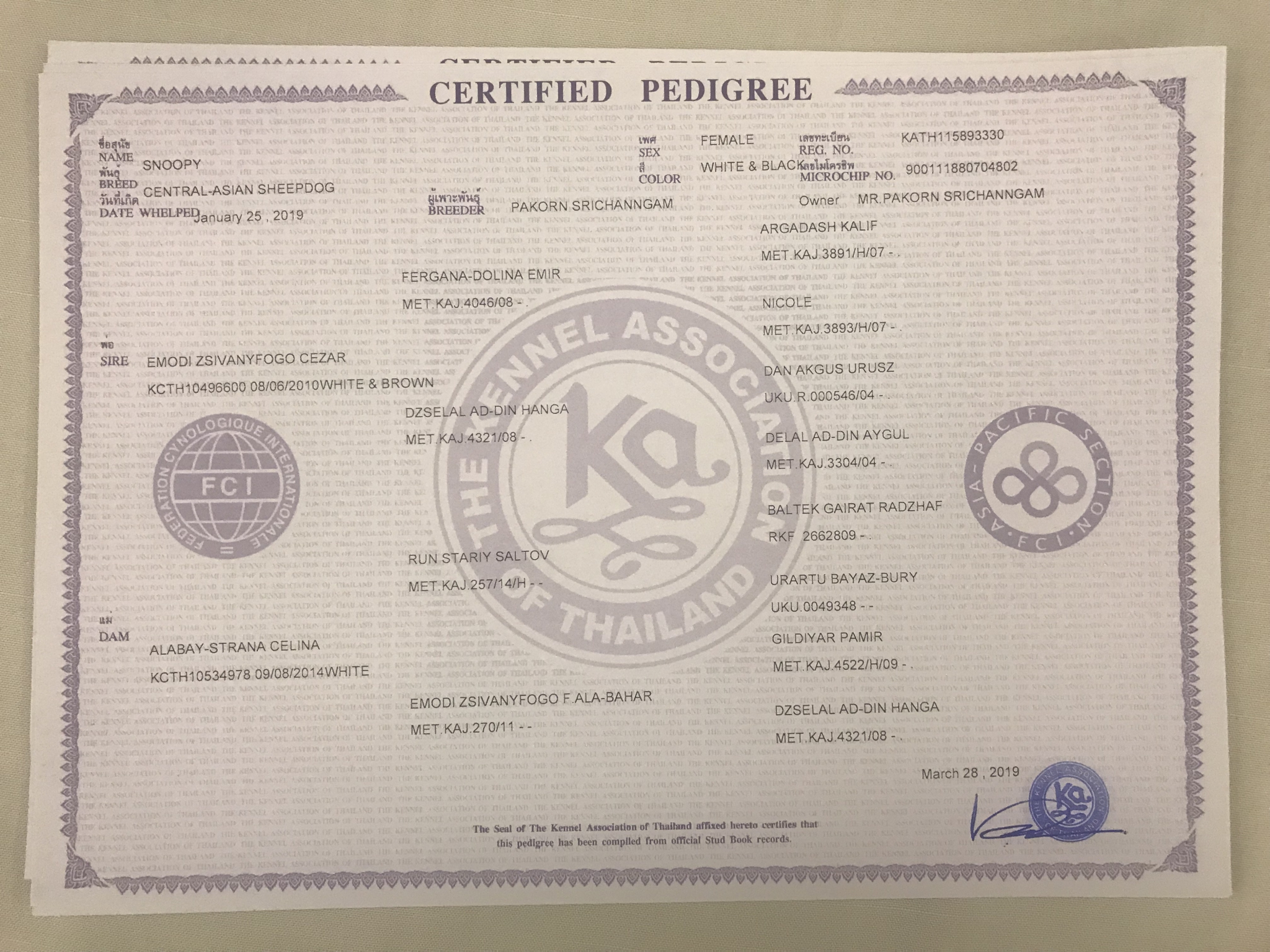 2.ใบ FCI เวอร์ชั่นต่างประเทศของตัวแม่พันธุ์ (มีบอก 4 GEN) ให้ดูได้